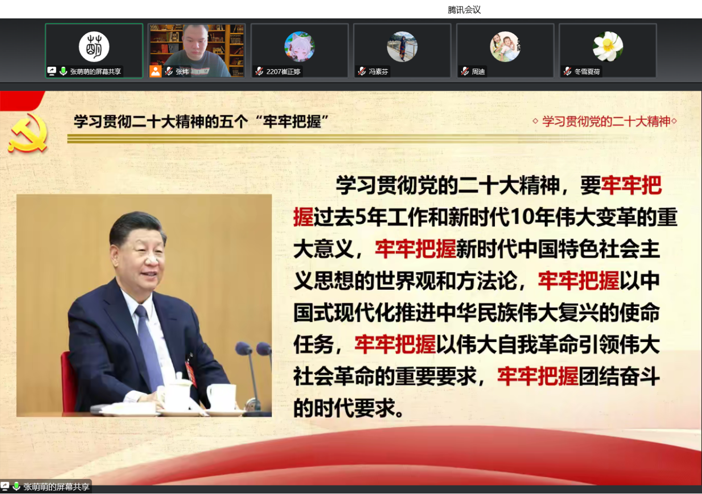 專題報(bào)告上,張萌萌書記介紹了黨的二十大的召開的背景和黨的二十大精神主題,從六個(gè)方面重點(diǎn)闡述了黨的二十大報(bào)告的內(nèi)容。強(qiáng)調(diào),要牢牢把握過去5年工作和新時(shí)代10年偉大變革的重大意義;牢牢把握新時(shí)代中國特色社會(huì)主義思想的世界觀和方法論;牢牢把握以中國式現(xiàn)代化推進(jìn)中華民族偉大復(fù)興的使命任務(wù);牢牢把握以偉大自我革命引領(lǐng)偉大社會(huì)革命的重要要求;牢牢把握團(tuán)結(jié)奮斗的時(shí)代要求以及黨的二十大報(bào)告的其他創(chuàng)新點(diǎn)。
