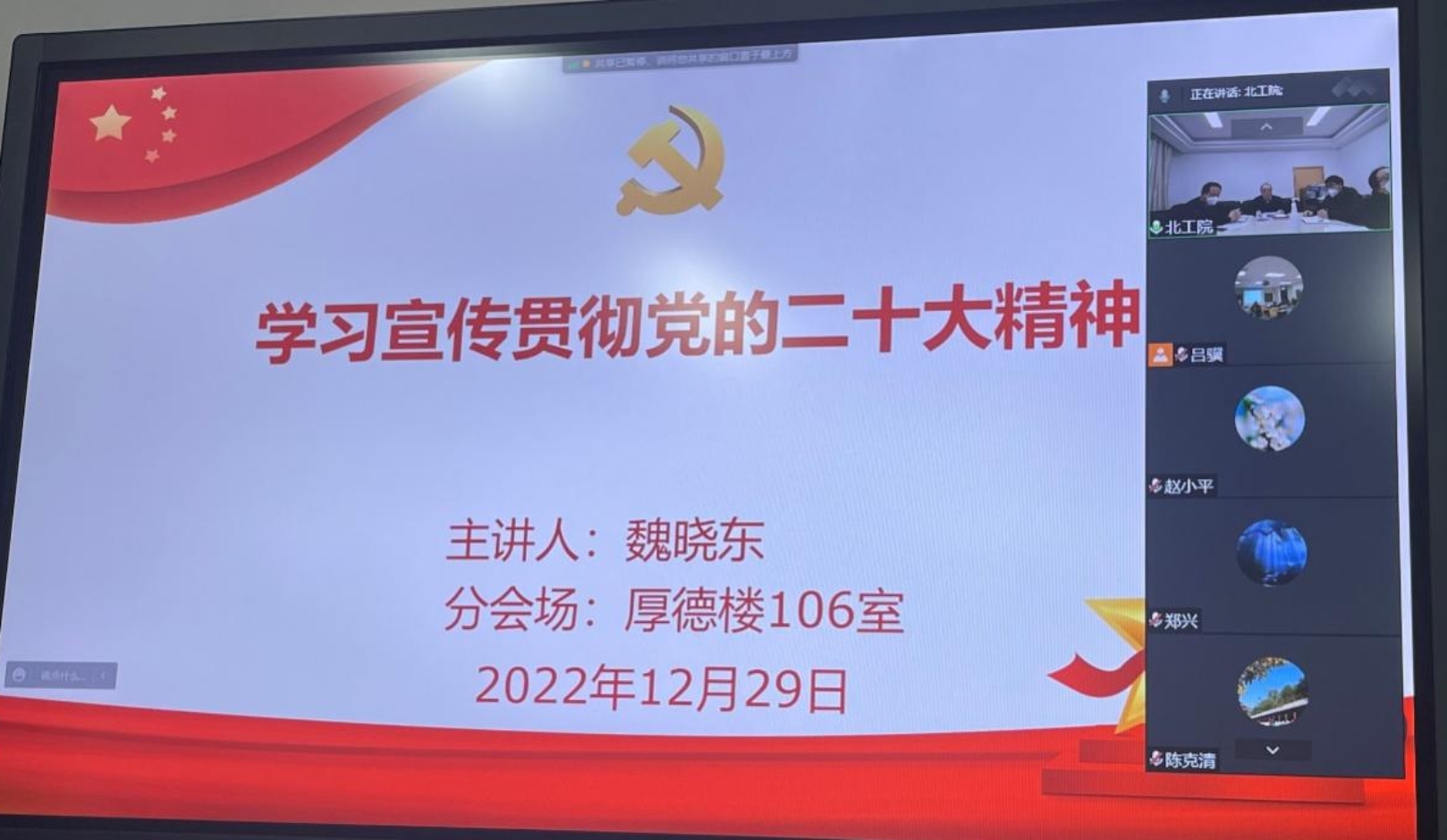 為持續深入學習宣傳貫徹黨的二十大精神,推動黨的二十大精神深入基層、深入一線、深入師生,12月29日上午,學校黨委副書記魏曉東采用“線上+線下”方式,為學工聯合黨總支、建筑工程與測繪學院黨總支和校工會的黨員干部開展黨的二十大精神專題宣講會,會議由學工聯合黨總支書記賀繼偉主持。