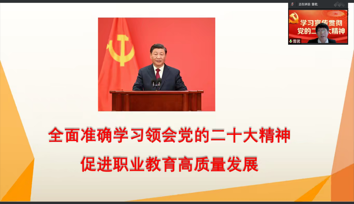 為深入學習宣傳貫徹黨的二十大精神,12月30日下午,黨委常委、副院長周燕以“全面準確學習領會黨的二十大精神,促進職業教育高質量發展”為主題作黨的二十大精神專題宣講。圖書聯合黨總支全體黨員以及入黨積極分子參加此次宣講活動,宣講會采用線上形式開展。