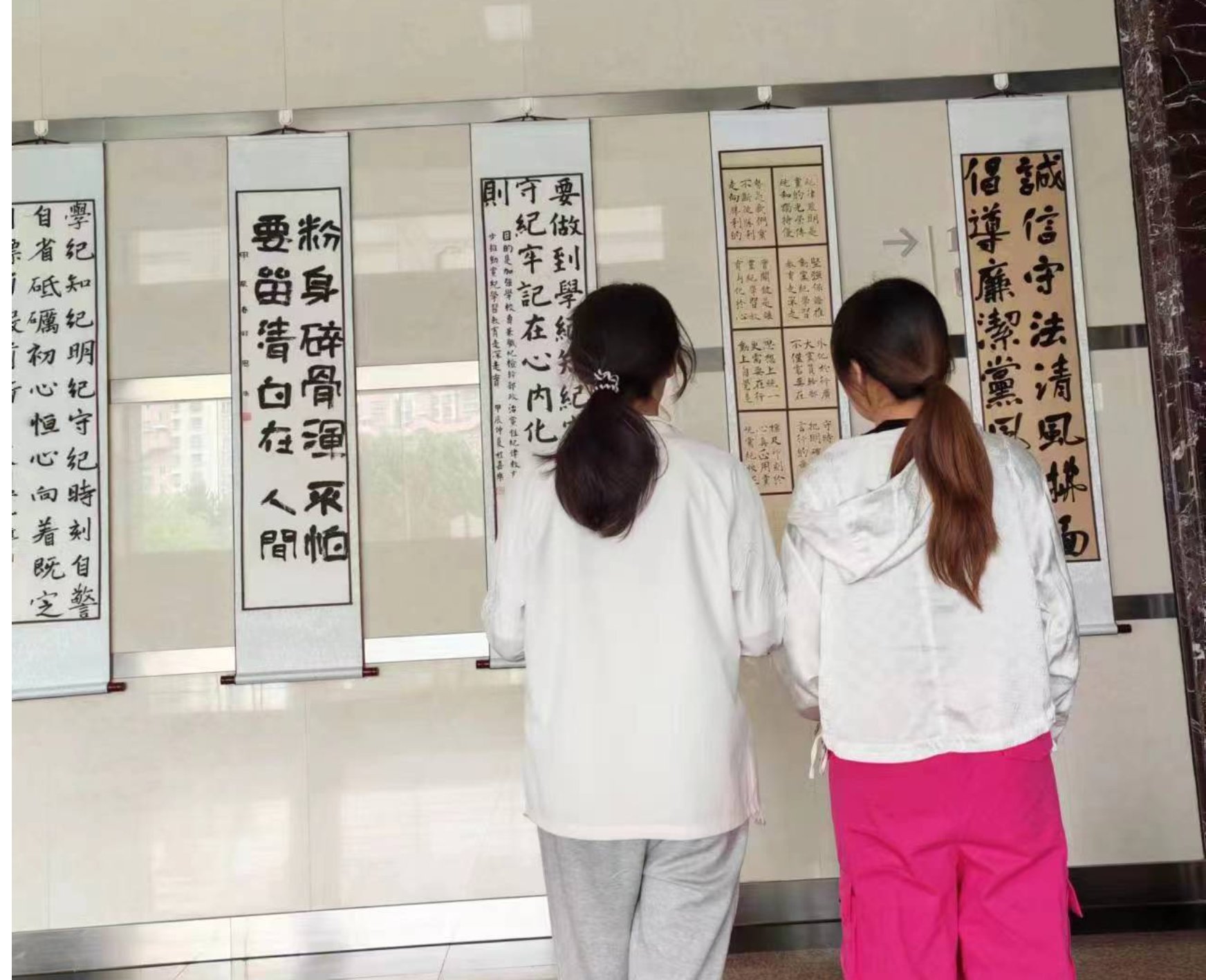 專題書畫展由學(xué)院關(guān)工委、繪夢苑社團承辦,共懸掛展覽20副廉潔書畫作品。活動現(xiàn)場,氣氛熱烈融洽。前來參觀的師生一起品鑒作品、交流感想。在一句句耐人尋味、發(fā)人深省的名言警句,一幅幅蒼勁有力、風(fēng)神灑蕩的藝術(shù)作品前,感受著激濁揚清、令人警醒的廉潔文化意境。