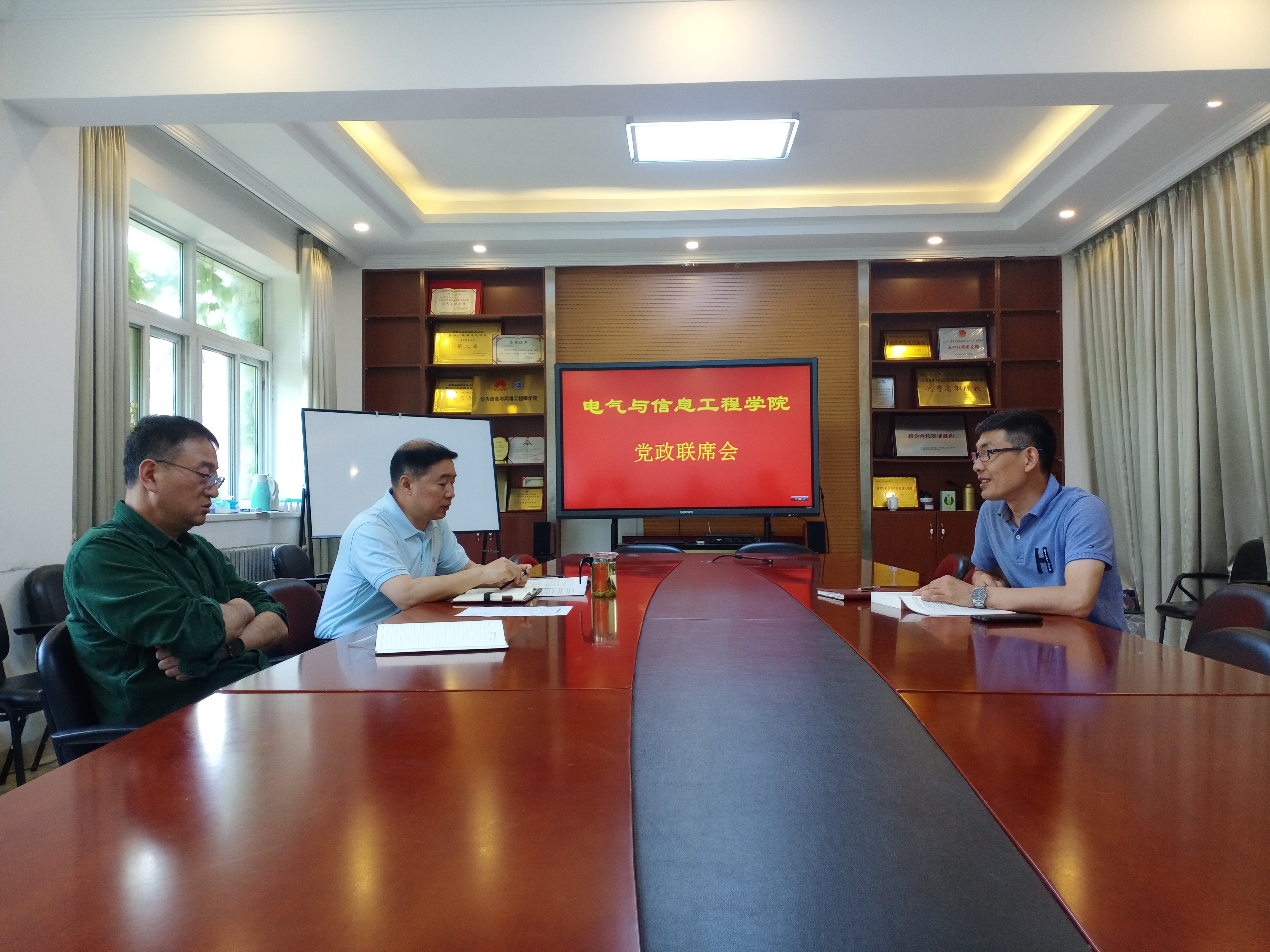電信學院五月黨政聯席暨總支委員會于19日上午10:30在創新樓三層會議室召開。黨總支書記徐煒彥主持會議。院長王巍、黨總支副書記兼學生黨支部書記郎博參加會議。
