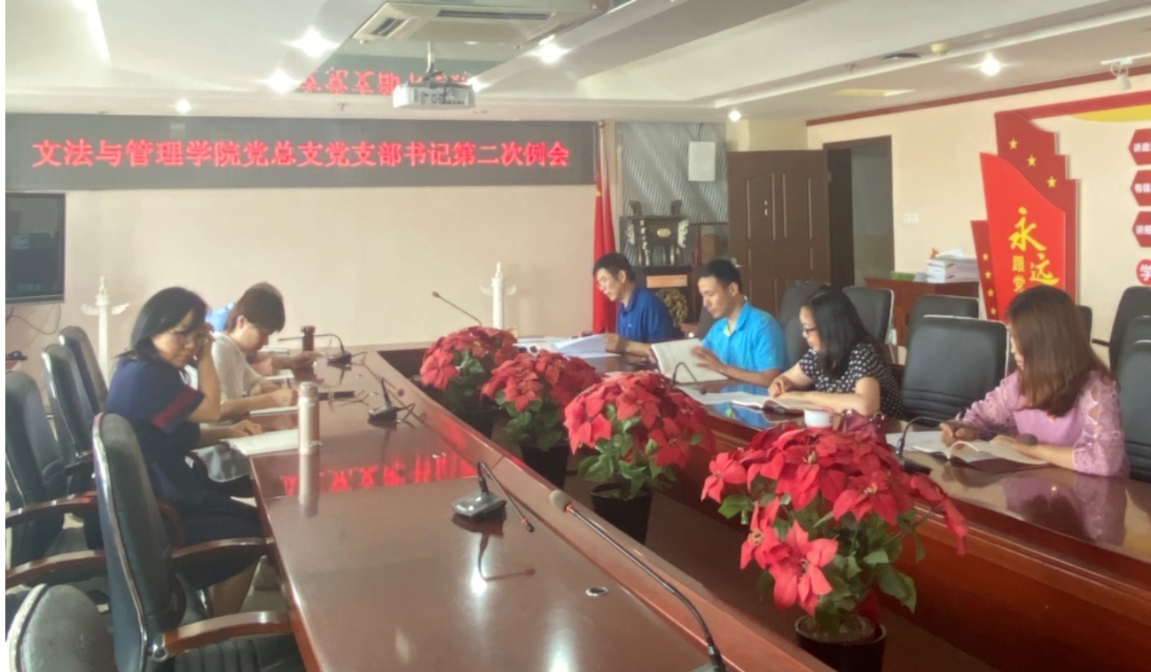 2021年6月26日中午一點,文法與管理學院黨總支在學院會議室召開了本學期第二次黨支部書記工作例會,學院黨總支委員、黨支部書記參加了會議,黨總支書記楊嶺主持會議。