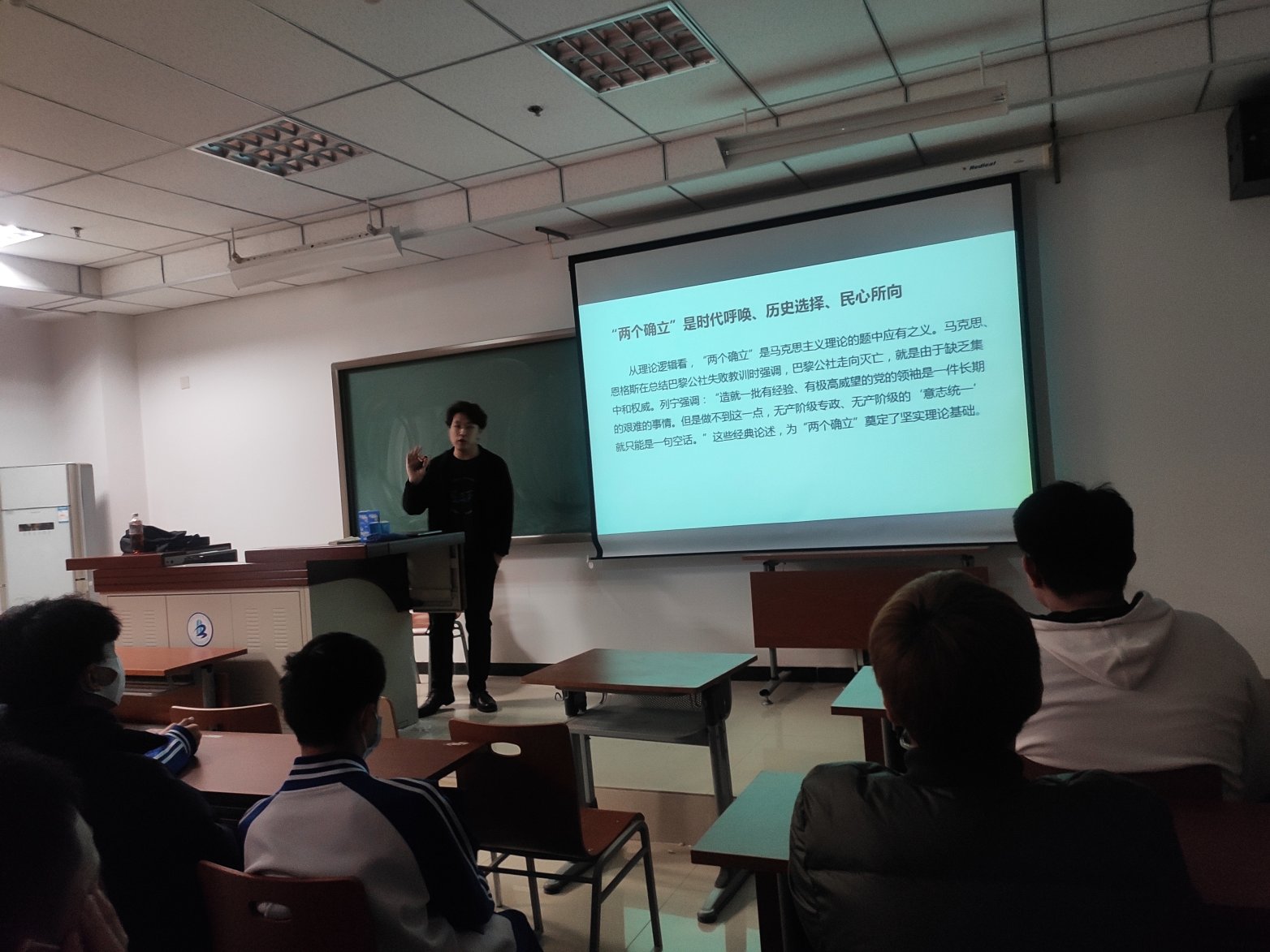 李鵬飛老師講到,在中國(guó)共產(chǎn)黨百年華誕的重要時(shí)刻,在“兩個(gè)一百年”奮斗目標(biāo)歷史交匯關(guān)鍵節(jié)點(diǎn)上,黨的十九屆六中全會(huì)勝利召開(kāi),審議通過(guò)了《中共中央關(guān)于黨的百年奮斗重大成就和歷史經(jīng)驗(yàn)的決議》,審議通過(guò)了《關(guān)于召開(kāi)黨的第二十次全國(guó)代表大會(huì)的決議》。全會(huì)全面總結(jié)黨的百年奮斗重大成就和歷史經(jīng)驗(yàn),深刻揭示了“過(guò)去我們?yōu)槭裁茨軌虺晒Α⑽磥?lái)我們?cè)鯓硬拍芾^續(xù)成功”,對(duì)于推動(dòng)全黨進(jìn)一步統(tǒng)一思想、統(tǒng)一意志、統(tǒng)一行動(dòng),更加堅(jiān)定自覺(jué)地踐行初心使命,在新時(shí)代更好堅(jiān)持和發(fā)展中國(guó)特色社會(huì)主義,具有重大現(xiàn)實(shí)意義和深遠(yuǎn)歷史意義。李鵬飛老師談到,會(huì)議高度概括了“十個(gè)堅(jiān)持”寶貴經(jīng)驗(yàn),具有重大的政治意義、歷史意義和時(shí)代意義。希望各位同學(xué)深入學(xué)習(xí)貫徹十九屆六中全會(huì)精神,在學(xué)習(xí)中汲取智慧力量,努力把學(xué)習(xí)成果轉(zhuǎn)化為成長(zhǎng)成才的強(qiáng)大動(dòng)力。