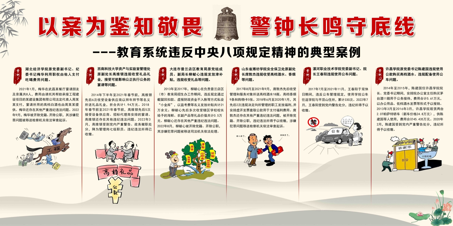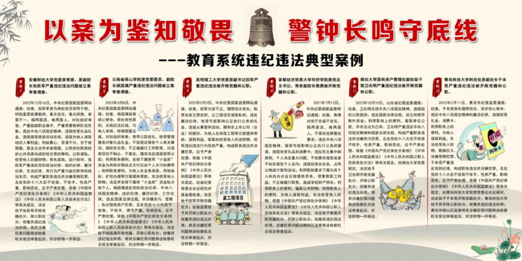 為深入貫徹黨的二十大精神,推動學習貫徹習近平新時代中國特色社會主義思想主題教育走深走實,不斷強化黨員干部廉潔意識,筑牢拒腐防變思想防線,學校紀委制作了一期警示教育宣傳展板,在學校匠心樓一層大廳進行展示。專題展主要分三個部分“習近平總書記在二十屆中央紀委二次全會上的講話金句、警鐘長鳴——教育系統違紀違法典型案例、嚴守底線——教育系統違反中央八項規定典型案例”。