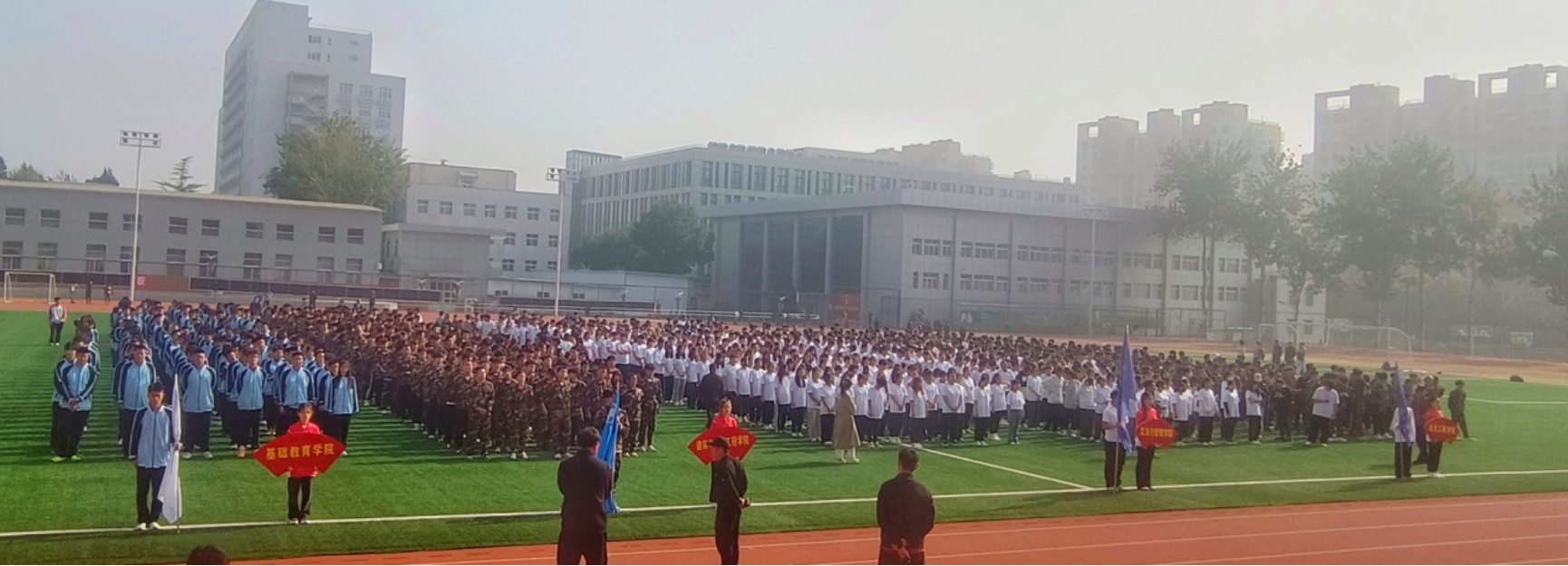 11月1日中午,北京工業職業技術學院2023級新生第九套廣播體操比賽在學校體育場舉行。校黨委常委、副院長周燕,校黨委常委、副院長史運濤,學生工作處處長梁文學、校團委書記鄭興、機電工程學院黨總支書記王懷群、信息工程學院黨總支書記徐煒彥、建筑與測繪工程學院黨總支書記賀繼偉、文法與管理學院黨總支書記劉建新、體育部直屬黨支部書記梁賦、體育部副主任王琦、基礎教育學院黨總支副書記史偉等在主席臺就座,作為本屆比賽評委為參賽院隊進行評分和頒獎,校黨委常委、副院長周燕宣布比賽開始。體育部郝澤亮老師主持比賽。