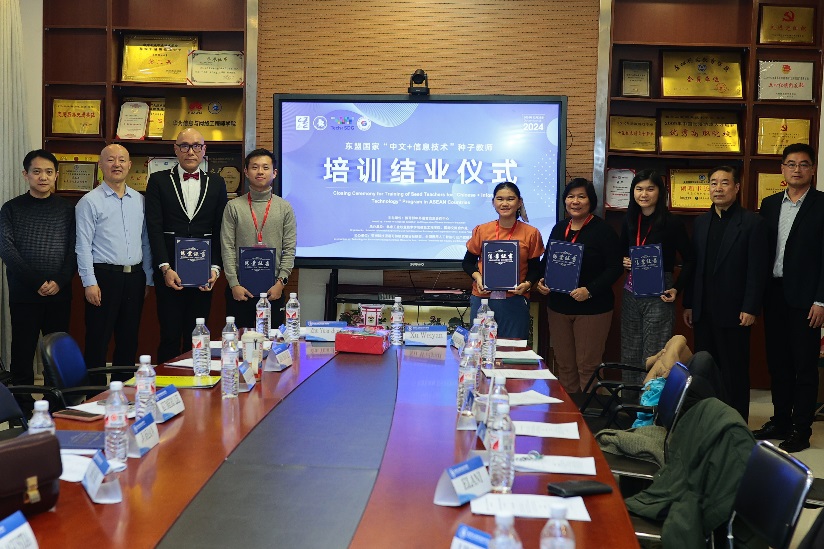 2024年12月28日下午,由教育部中外語言交流合作中心主辦,北京工業職業技術學院承辦的東盟國家“中文+信息技術”種子教師培訓結業儀式在我校創新樓308會議室舉行。信息工程學院黨總支書記徐煒彥、院長朱元忠、黨總支副書記劉同師、副院長方園、教師宋玉娥參加了結業儀式。會議由信息工程學院院長朱元忠主持。