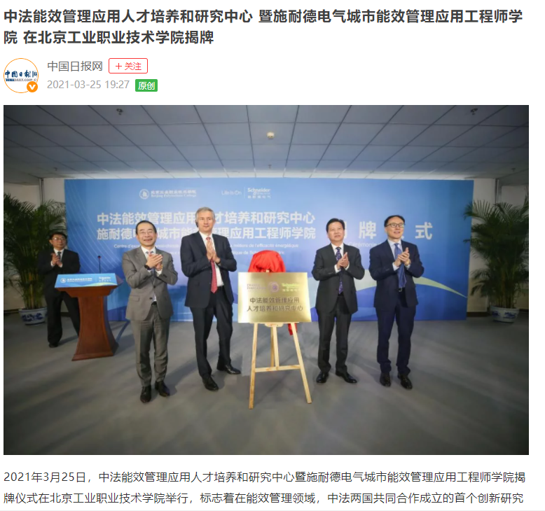 3月25日,中法能效管理應用人才培養和研究中心暨施耐德電氣城市能效管理應用工程師學院揭牌儀式在我校舉行。北京工業職業技術學院和施耐德電氣共建“中法能效管理應用人才培養和研究中心暨施耐德電氣城市能效管理應用工程師學院”是中法兩國推進職業教育國際合作典型代表,也是北京市深化產教融合的具體體現,對于推動首都職業教育高質量發展具有積極的借鑒意義。揭牌儀式受到了中國教育電視臺、中國教育報、中國新聞網、中國日報網、北京電視臺、北京商報、職教強國、現在職業教育網、職教之音等媒體的廣泛關注。