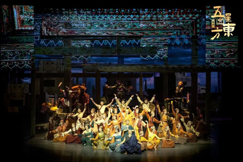 舞劇《五星出東方》的題材及構(gòu)思來源于古絲綢之路上新疆和田地區(qū)民豐縣尼雅遺址出土的國家一級文物“五星出東方利中國”漢代織錦護臂。在這部作品中,國寶不再是靜靜躺在博物館里的陳列品,而是傳奇的見證者、講述者。故事穿越歷史的長河、跨過時空的大門,再現(xiàn)了西域戍邊的漢族校尉與匈奴人在精絕古城經(jīng)歷種種變故之后,最終化干戈為玉帛并建立深厚友誼的動人故事,詮釋了各族人民“像石榴籽一樣緊緊抱在一起”的團結(jié)精神,突出了中華民族共同體的主題。
