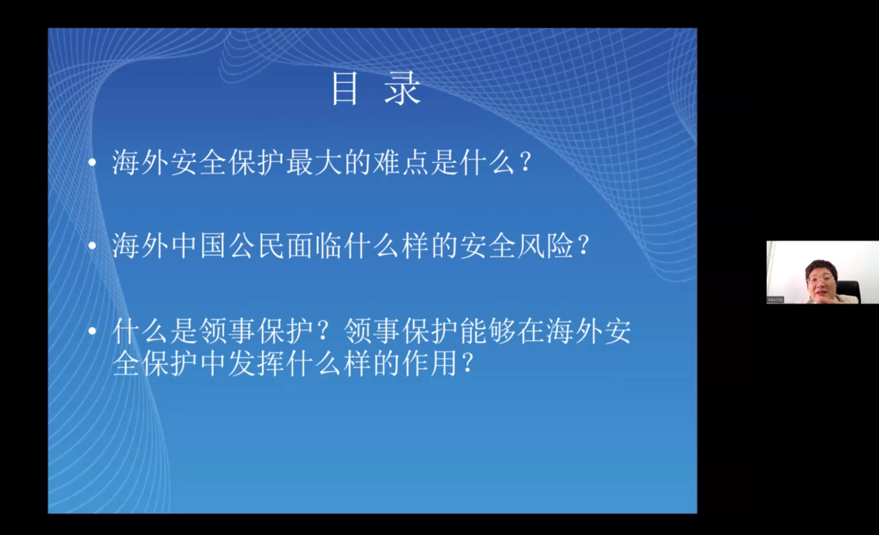 外交學(xué)院的夏莉萍教授的培訓(xùn)內(nèi)容是中國領(lǐng)事保護(hù)相關(guān)情況介紹。夏莉萍教授向大家進(jìn)行了關(guān)于我國領(lǐng)事保護(hù)保護(hù)事項的政策解讀,介紹了領(lǐng)事保護(hù)能在海外安全保護(hù)發(fā)揮的重要作用。