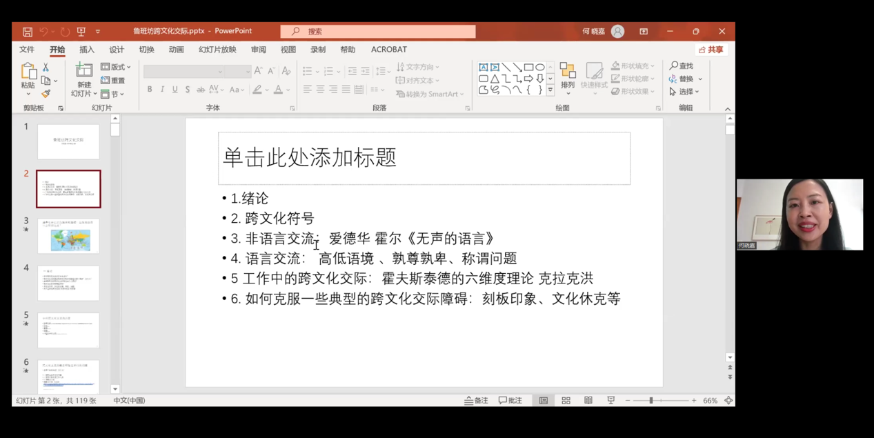 華東師范大學(xué)國際漢語文化學(xué)院的何曉嘉副教授帶來的是跨文化交際案例分析與適應(yīng)能力培養(yǎng)課程,課程內(nèi)容包含跨文化符號、非語言交流、工作中的跨文化交際以及如何克服一些典型的跨文化障礙。