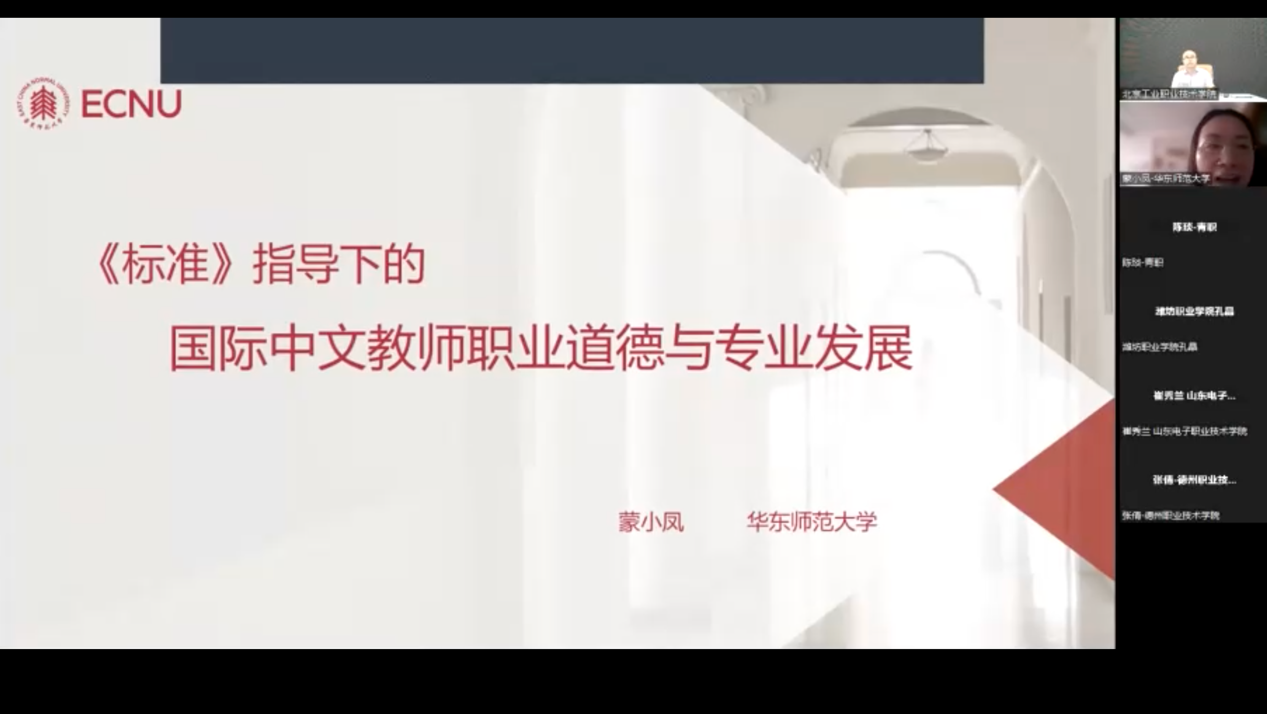 華東師范大學(xué)的蒙小鳳副教授對國際中文教師職業(yè)道德與專業(yè)發(fā)展進(jìn)行了介紹,以職業(yè)道德為基礎(chǔ)幫助面向海外學(xué)生進(jìn)行教學(xué)的國際中文教師清楚的認(rèn)知對國際中文教師有哪些具體的要求,以及國際中文教師有哪些具體的專業(yè)發(fā)展來進(jìn)行培訓(xùn)。