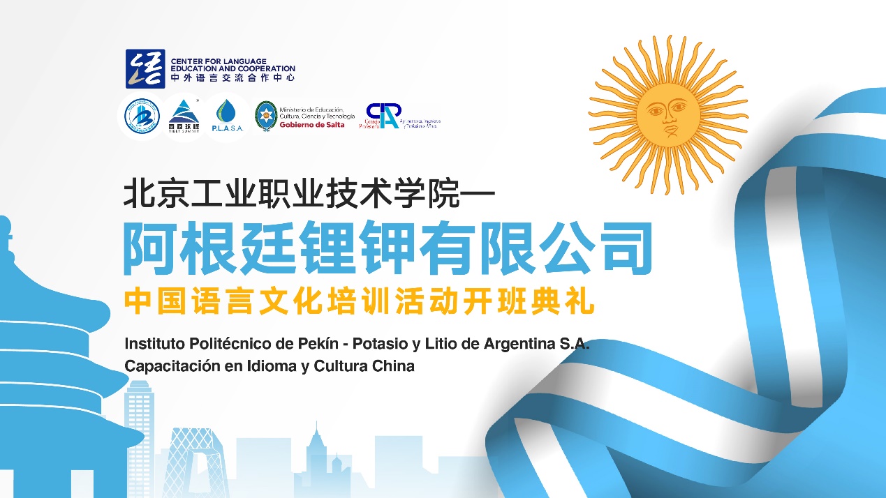 北京時間11月2日早上,阿根廷當?shù)貢r間11月1日晚上,北京工業(yè)職業(yè)技術(shù)學(xué)院—阿根廷鋰鉀有限公司中國語言文化培訓(xùn)活動開班典禮于線上順利舉行。中國教育部中外語言交流合作中心黨委副書記于天琪,北京市教育委員會副主任孫其軍,中國駐阿根廷使館商務(wù)參贊夏娣婭,阿根廷薩爾塔省經(jīng)濟和公共服務(wù)部部長羅伯特?迪布?阿舒爾,北京工業(yè)職業(yè)技術(shù)學(xué)院黨委副書記、院長安江英,薩爾塔省工程師協(xié)會基金會(COPAIPA)主席費利佩?比埃拉、薩爾塔省教育秘書迭戈·洛佩茲·莫里約,阿根廷鋰鉀有限公司董事長茅元愷,阿根廷鋰鉀有限公司副總經(jīng)理季新生等領(lǐng)導(dǎo)共同出席了開班典禮。參加此次開班典禮的還有來自阿根廷鋰鉀有限公司90余名企業(yè)學(xué)員。開班典禮由北京工業(yè)職業(yè)技術(shù)學(xué)院國際交流合作處副處長孟晴主持。