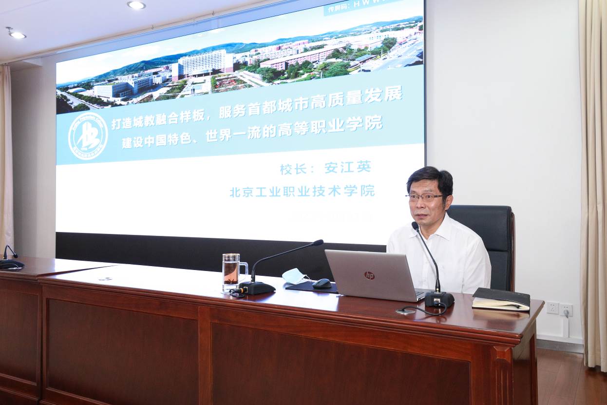 黨委副書記、院長安江英代表學校歡迎來自全國高職院校的領導蒞臨我校考察調研,希望各位高校領導繼續支持北京工業職業技術學院的發展,加強交流合作,攜手共進,為職業教育發展貢獻力量。安院長從學校基本情況、事業發展情況、今后工作思路三方面做了詳細介紹。重點分享了學校精準辦學定位,打造城教融合高地;優化人才培養模式,提升人才培養質量;推進產教融合深度,強化校企協同育人;注重職業素養教育,提升學生綜合素質;構建高水平教學團隊,持續優化雙師結構;構建技術技能平臺,彰顯社會服務能力;開放融合共享標準,樹立職業教育品牌;加強創新創業教育,就業質量保持領先;全面加強黨的建設,提供堅強政治保證等方面的思路和做法。安院長還介紹了學校建設總體目標和實施兩步走的建設規劃目標,并表示經過建設,學校要闖出一條職業院校服務城市發展的新路子,成為全國城教融合的典范,舞起改革龍頭、打造職教樣板,充分展示新時代高職教育的競爭力和國際影響力。