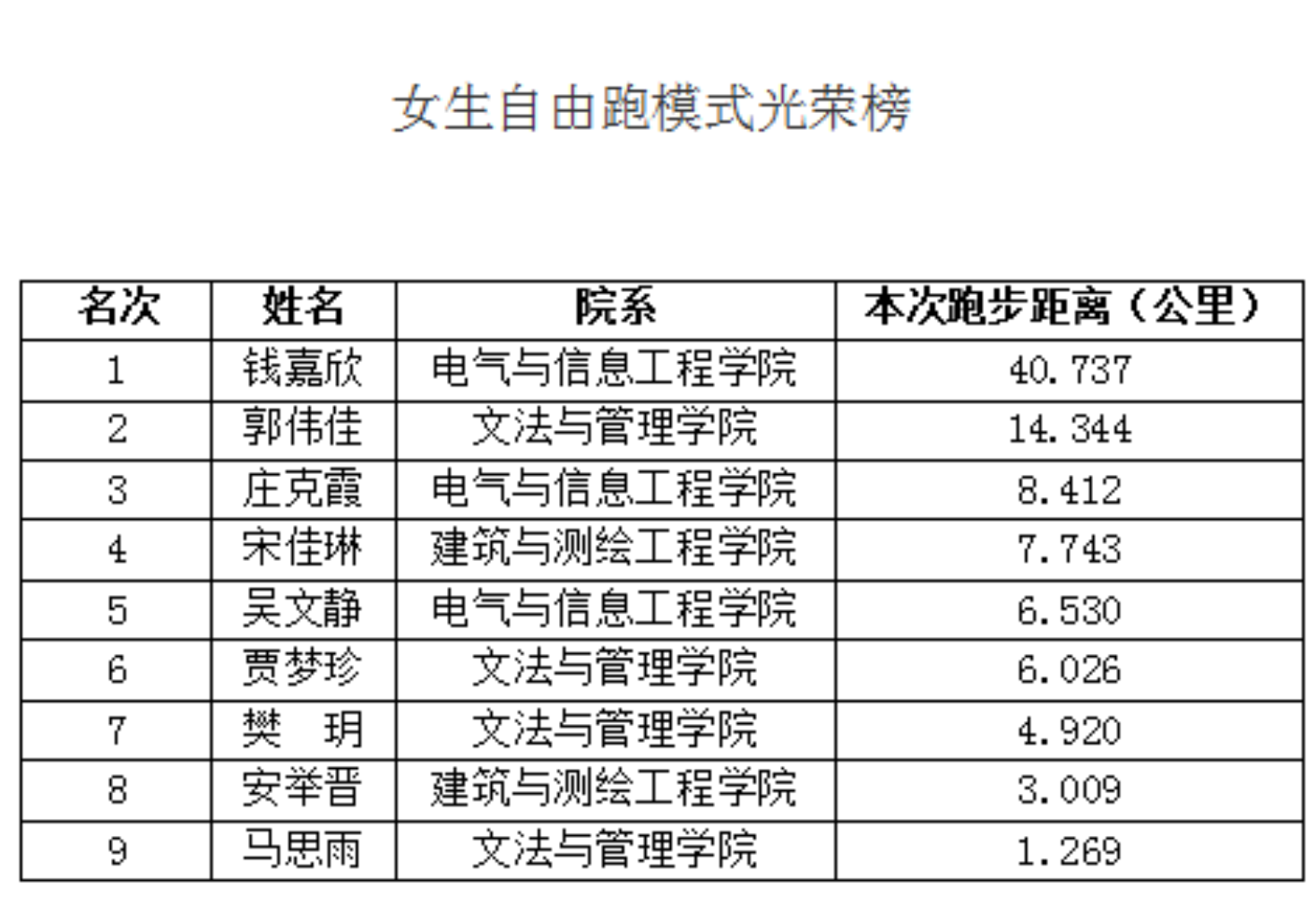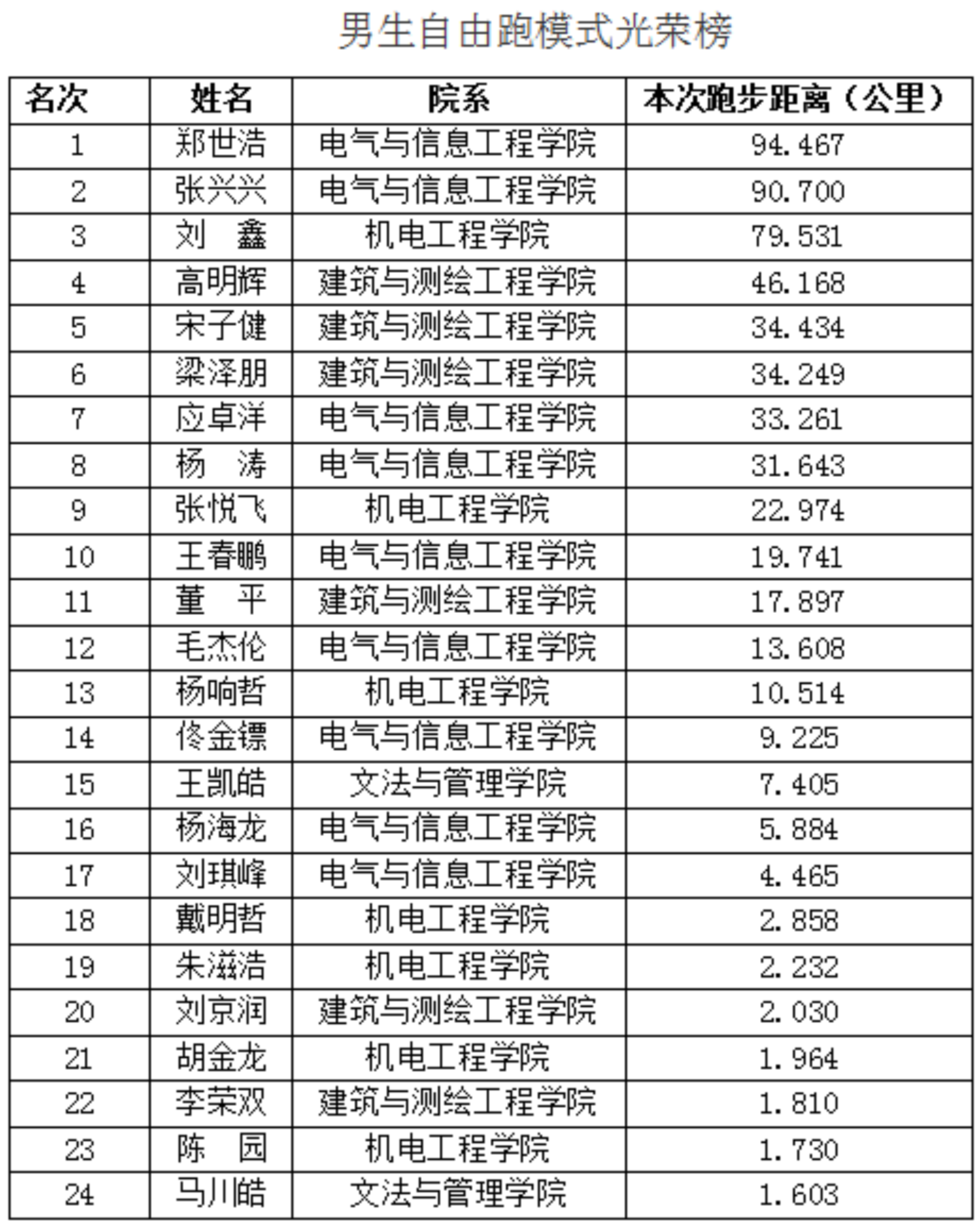 而針對已完成達標任務的同學,本次特設置了“自由跑”證書與紀念品模式。男同學鄭世浩最高成績達到了94公里的跑量,女同學錢嘉欣跑出了40多公里的好成績。以下同學將獲得學校頒布的長跑周名次證書并給予相應的運動裝備等紀念品。