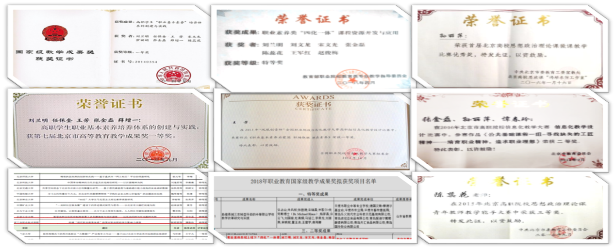 2012年北京市教學成果獎、2012年北京市優秀教學團隊、2013年全國信息化教學大賽一等獎、2014年國家級教學成果獎、2015年北京市高職思政課青年教師教學能手大賽三等獎、2016年北京市信息化教學大賽二等獎、2016年北京高校思想政治理論課微課教學比賽優秀獎、2017年首都高校思想政治理論課社會實踐論文特等獎、2018年國家教育教學成果獎、2019年首屆全國高校思想政治理論課教學展示活動二等獎、2020年入選北京市教育工委“黨課開講了”優質項目…在部門領導的帶領下,教師們上下一致、團結一心,結出碩果累累!