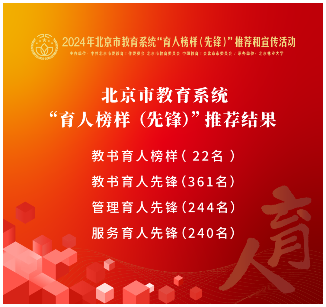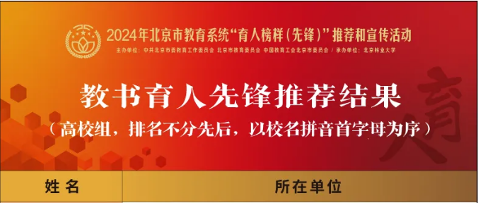 2024年北京市教育系統“育人榜樣(先鋒)”推薦和宣傳活動由中共北京市委教育工委、北京市教育委員會、北京市教育工會聯合開展。在學校黨委的統一部署下,我校開展了校級“育人先鋒”評選及北京市教育系統“育人榜樣(先鋒)”推薦工作。經相關程序,共評選出校級“育人先鋒”18人,并從其中推薦老師參評北京市教育系統“育人榜樣(先鋒)”。經過評比,最終我校6人榮獲北京市教育系統“育人先鋒”,這是我校“全員育人、全程育人、全方位育人”的生動實踐和重要成效。