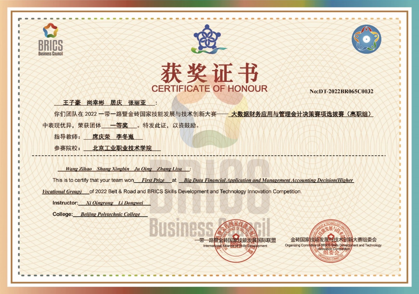 近日,由2022年金磚國家技能發展與創新大賽組委會、一帶一路暨金磚國家技能發展國際聯盟主辦的兩項大賽頒發獲獎證書,我校大數據與會計專業師生在該賽項中取得優異成績。