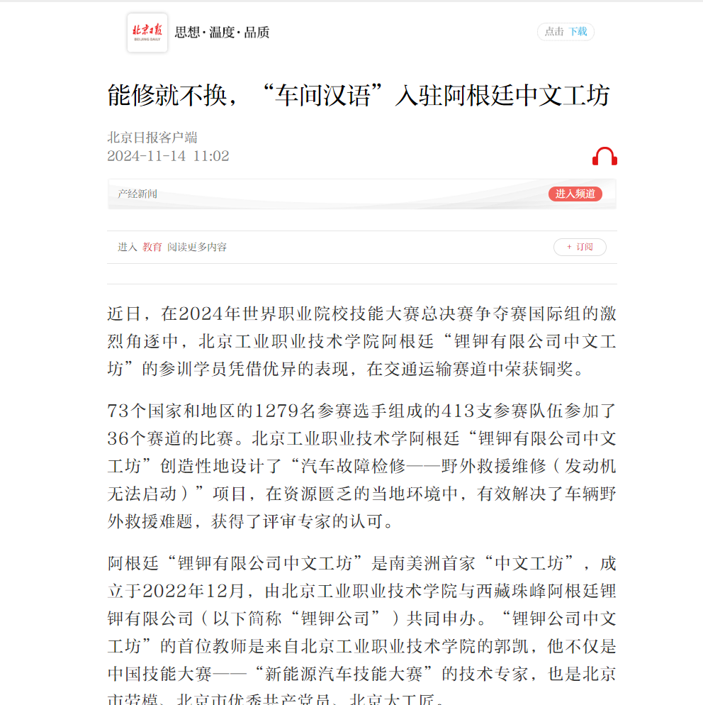 在世界中文大會(huì)召開(kāi)前夕,北京日?qǐng)?bào)重磅刊發(fā)我校“車(chē)間漢語(yǔ)”入駐阿根廷中文工坊,為服務(wù)當(dāng)?shù)厣鐣?huì),促進(jìn)民心相通作出職教貢獻(xiàn)。文章詳細(xì)報(bào)道了我校郭凱老師作為南美首個(gè)中文工坊的首位教師,遠(yuǎn)赴阿根廷“鋰鉀有限公司中文工坊”推廣“車(chē)間漢語(yǔ)”,培育“中文+汽修”人才,向世界展現(xiàn)新時(shí)代的中國(guó)工匠文化精神,培養(yǎng)心心相印的“一帶一路”建設(shè)者的優(yōu)秀事跡。