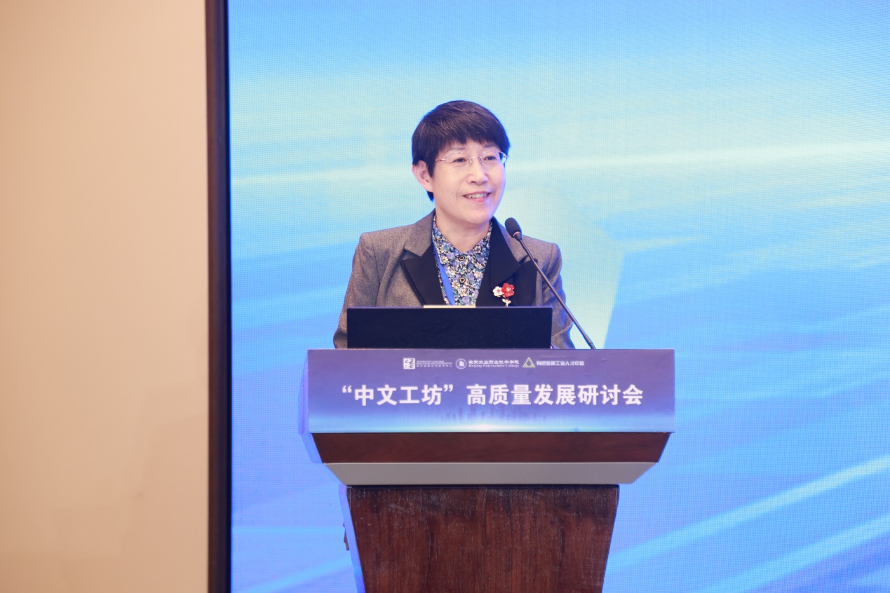 我校安江英院長(zhǎng)代表學(xué)校發(fā)表致辭。安院長(zhǎng)指出,2021年學(xué)校與教育部語(yǔ)合中心共建了“中文+職業(yè)技能”教育實(shí)踐與研究基地,基地的主要職能有“中文+職業(yè)技能”各類培訓(xùn)、“中文+職業(yè)技能”教學(xué)資源開(kāi)發(fā)、“中文+職業(yè)技能”相關(guān)學(xué)術(shù)研究等。近年來(lái)學(xué)校在“中文+職業(yè)技能”領(lǐng)域做了大量的探索與實(shí)踐,如開(kāi)展海外中資企業(yè)本土員工“中文+職業(yè)技能”培訓(xùn)、“中文+職業(yè)技能”教材開(kāi)發(fā)、海外本土中文教師培養(yǎng)、漢語(yǔ)橋項(xiàng)目等,為“一帶一路”沿線國(guó)家培養(yǎng)了大量?jī)?yōu)秀的技術(shù)技能人才,增進(jìn)了“一帶一路”國(guó)家人民之間的友好交流與民心相通。同時(shí)我校還與教育部語(yǔ)合中心、西藏珠峰阿根廷鋰鉀有限公司合作共建了南美洲第一家中文工坊—阿根廷“鋰鉀有限公司中文工坊”,今年我校將派出1名北京大工匠—機(jī)電工程學(xué)院的郭凱老師赴阿根廷為企業(yè)本土員工開(kāi)展“中文+職業(yè)技能”培訓(xùn)。“中文工坊”是語(yǔ)合中心于2021年創(chuàng)新推出的新型教學(xué)模式,目前已成為職業(yè)教育國(guó)際化發(fā)展的重要平臺(tái),是職業(yè)院校提升服務(wù)能力,推動(dòng)“雙高”建設(shè)的重要途徑,是促進(jìn)海外中資企業(yè)可持續(xù)發(fā)展的有效措施。希望通過(guò)此次研討會(huì),能夠推動(dòng)國(guó)內(nèi)職業(yè)院校及海外中資企業(yè)中文工坊建設(shè),助力校企協(xié)同走出去,服務(wù)國(guó)際產(chǎn)能合作。研討會(huì)旨在就中文工坊項(xiàng)目建設(shè)模式、運(yùn)營(yíng)組織、語(yǔ)言教學(xué)與技能實(shí)訓(xùn)等建設(shè)內(nèi)容進(jìn)行研討,以期完善各個(gè)中文工坊項(xiàng)目的管理與運(yùn)營(yíng)水平,搭建交流平臺(tái)、構(gòu)建長(zhǎng)效機(jī)制。