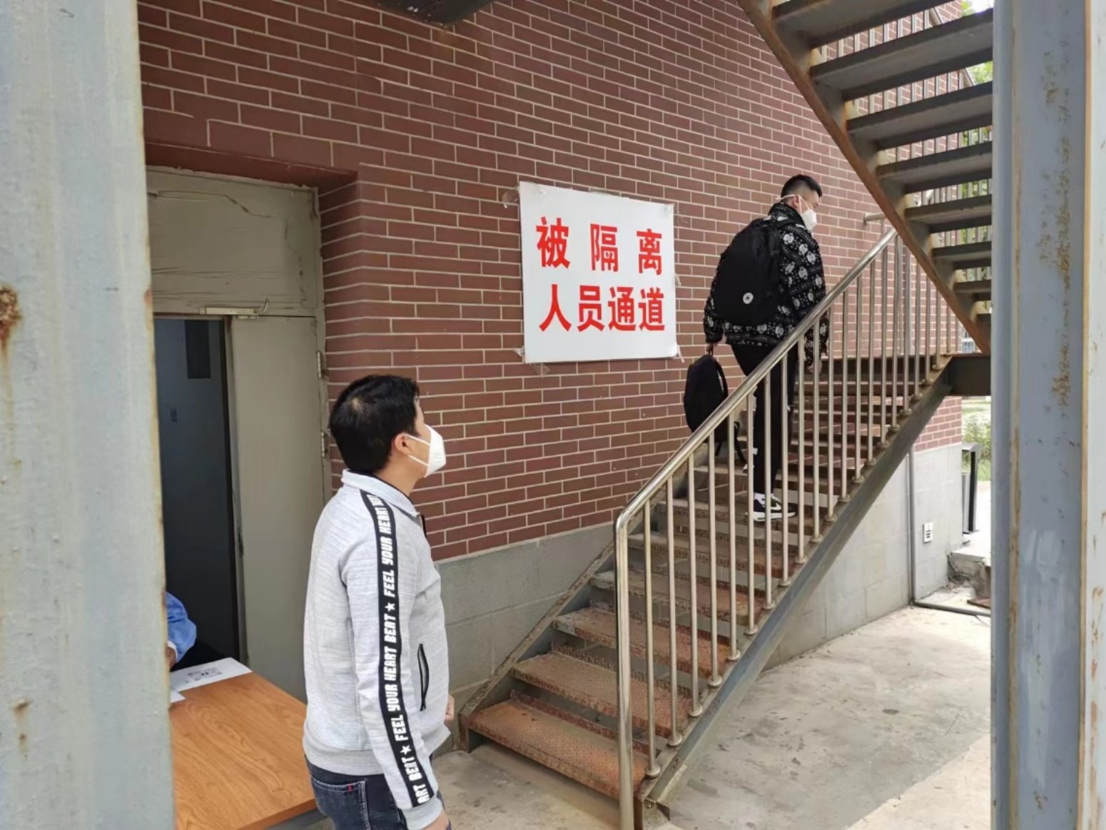 班主任王昫在入口登記學生信息,并送學生入住健康驛站