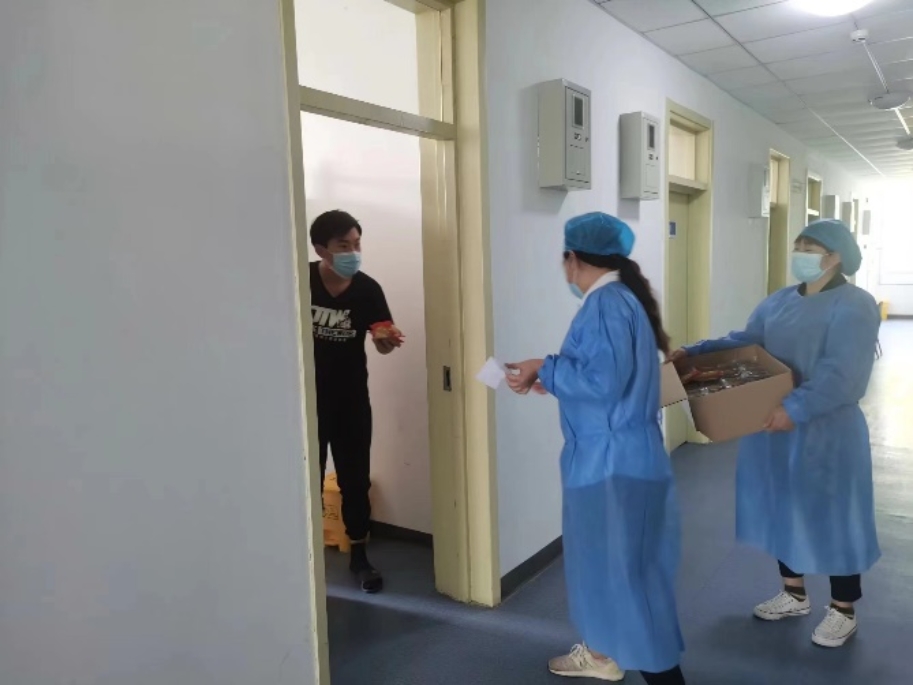 集中健康監測開始以來,每到飯點,就能看見這樣一群身影,飲食中心的工作人員或步行或騎車,按時來到健康驛站,將熱騰騰的飯菜交給驛站值守的工作人員,值守人員兩兩分組,默契配合,清點好餐食后,拉著小推車每層樓、每間房地給學生分餐送餐,他們送去的不僅僅是一份可口的餐食,也是一份暖心的關愛。8月28日開始,飲食服務中心已經為健康驛站運送隔離餐4625人次,每日想方設法為同學們變換菜色和口味,保證能量供給。中秋節當日,學校還為健康驛站的同學們和工作人員準備了愛心月餅和中秋節祝福,撫慰了師生不能與家人團圓的思念之情,也進一步堅定了全校師生打贏疫情防控阻擊戰的信心和決心。