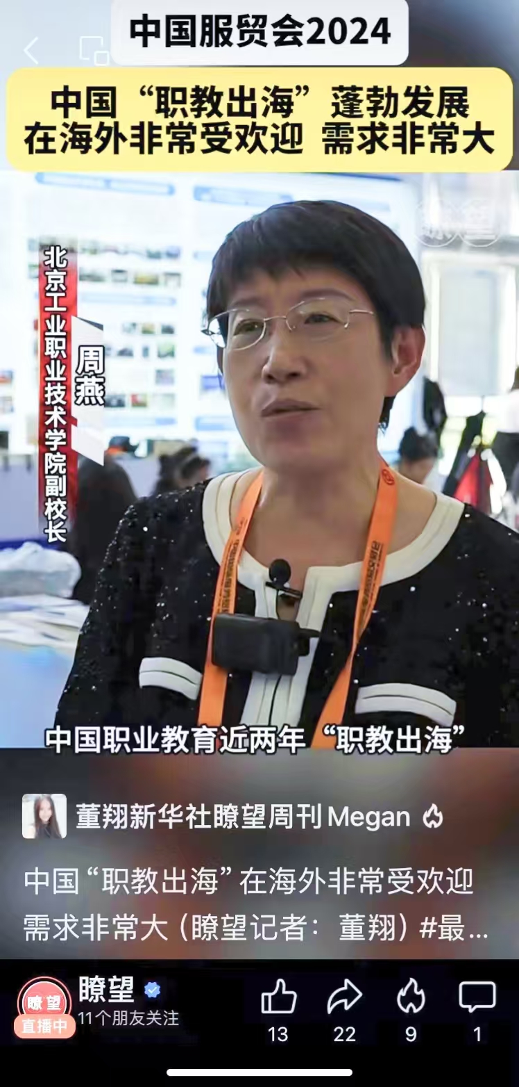 參展期間,我校的國(guó)際化辦學(xué)成果展示也受到了國(guó)內(nèi)多家主流媒體的關(guān)注,央視新聞直播、新華通訊社瞭望等多個(gè)融媒體平臺(tái)對(duì)我校展位進(jìn)行了專題采訪以及直播報(bào)道。
