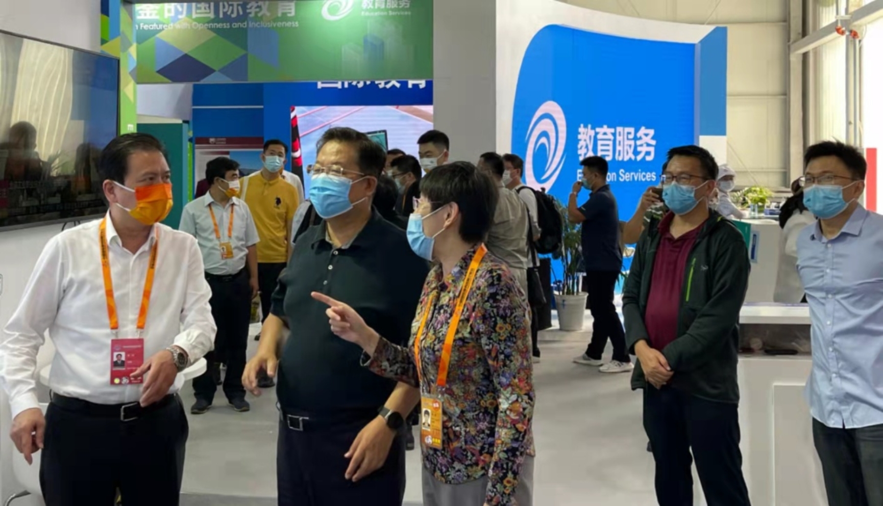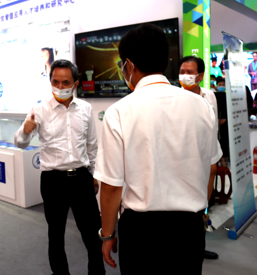 有色金屬工業人才中心副主任宋凱,施耐德電氣(中國)有限公司公共事務總監許屾、教育事務總監梁健等到服貿會現場支持我校參展工作
