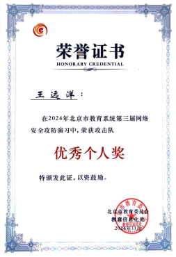 我校攻擊隊由網絡教研室2名專業教師和5名學生共同組成。在為期十天的激烈比拼中,攻擊隊不畏艱難,憑借卓越的團隊協作與精湛的專業技能,在演習中大放異彩,取得了850分的優異成績,贏得了北京市教委的特別表彰?,F場工程師班的王遠洋更是憑借個人出色的表現,榮獲“優秀個人獎”的榮譽稱號,充分彰顯了我校學生在網絡安全領域的深厚功底與實踐能力。