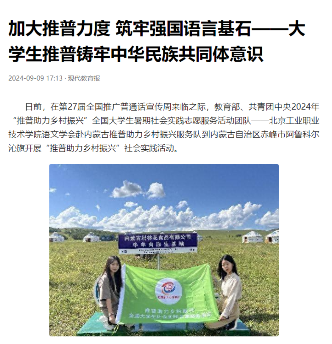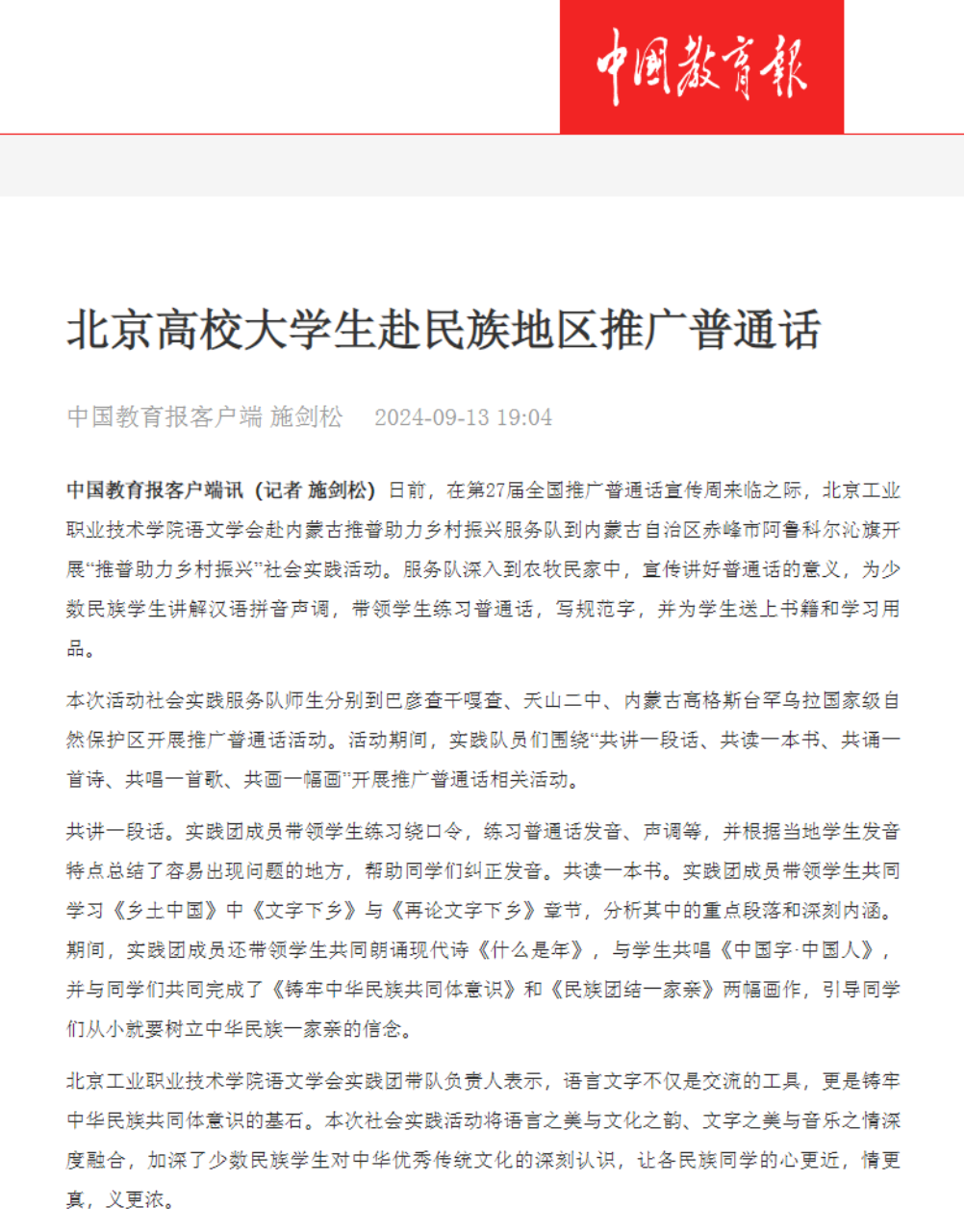 日前,在第27屆全國推廣普通話宣傳周來臨之際,教育部、共青團中央2024年“推普助力鄉村振興”全國大學生暑期社會實踐志愿服務活動團隊——北京工業職業技術學院語文學會赴內蒙古推普助力鄉村振興服務隊到內蒙古自治區赤峰市阿魯科爾沁旗開展“推普助力鄉村振興”社會實踐活動。將語言之美與文化之韻、文字之美與音樂之情深度融合,加深少數民族地區對中華優秀傳統文化的深刻認識,鑄牢中華民族共同體意識,讓各民族同學的心更近,情更真,義更濃。本次社會實踐活動得到了《中國教育報》《中國青年報》《現代教育報》《北京青年報》的關注和報道。