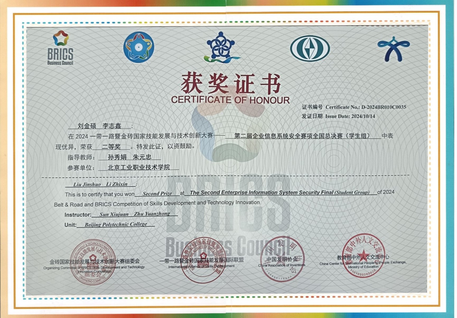 10月13日,2024一帶一路暨金磚國家技能發展與技術創新大賽之企業信息系統安全賽項全國總決賽在婁底職業技術學院舉行。在這場匯聚了全國職業院校精英的激烈角逐中,我校信息工程學院的參賽選手在84支隊伍中脫穎而出,其中網絡1971班的李志鑫、劉金碩同學位列第16名,榮獲全國二等獎(銀牌),我校榮獲優秀組織獎。