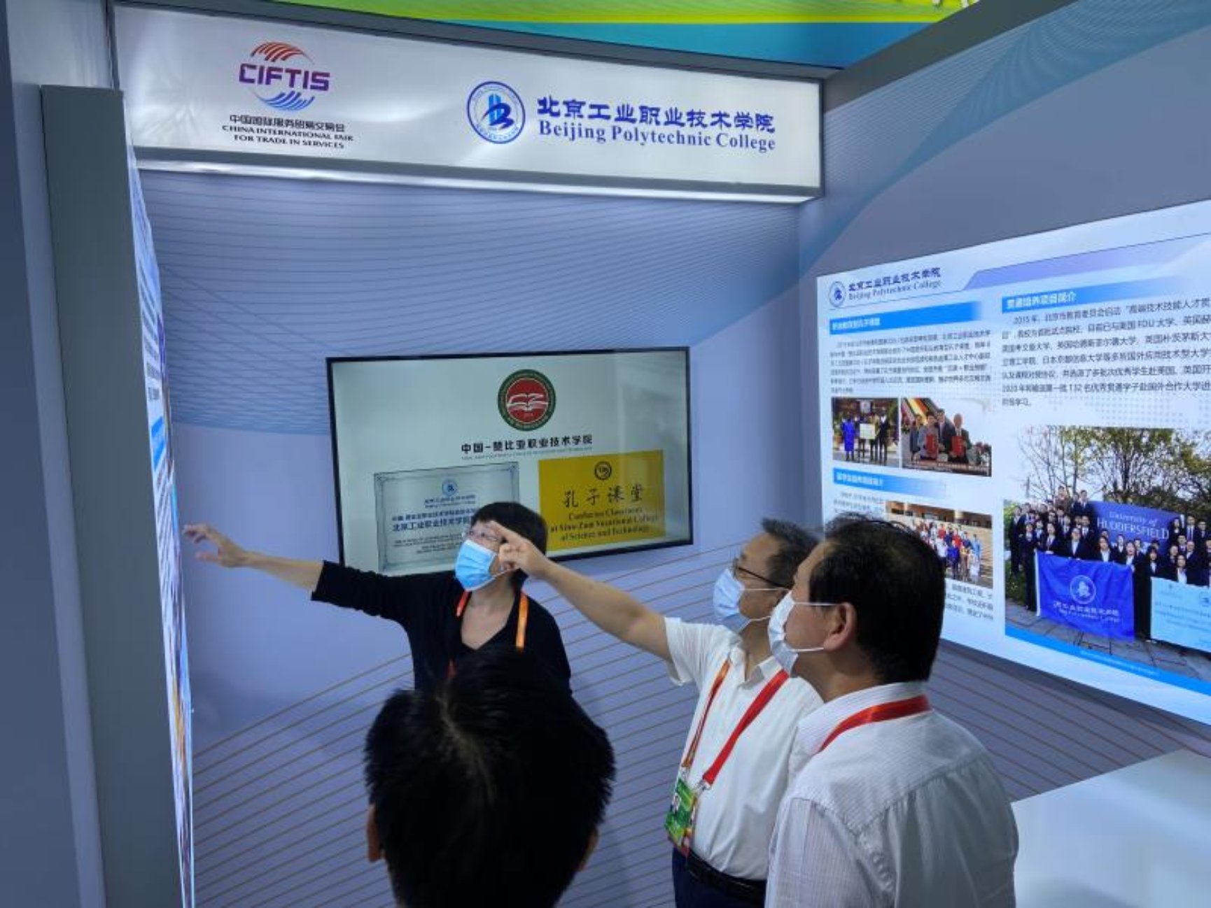 9月2日下午,北京市教育委員會主任劉宇輝、副主任黃侃一行來到我校展臺檢查指導。周燕副校長現場向市教委領導介紹了我校線下展出主要內容以及布展籌備情況。市教委領導對我校在職業教育“走出去”、海外合作辦學和服務國家“一帶一路”發展等方面所做的工作給予了充分肯定,并對我校積極參與服貿會及籌備工作給予了高度認可。
