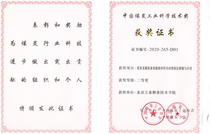 “采掘裝備超硬材料及耐磨涂層研制與應用”科技成果榮獲中國煤炭工業科學技術獎二等獎(我校證書編號:2020-265-D01),由北京工業職業技術學院、中國地質大學(北京)、北方工業大學、中煤科工集團西安研究院有限公司、中國礦業大學(北京)等七家單位共同研制。