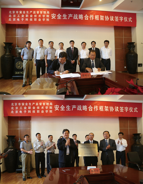 市安監局黨組書記、局長張樹森與北京工業職業技術學院陳建民校長簽署戰略合作框架協議;并共同為“安全生產職業技術學院”頒牌。