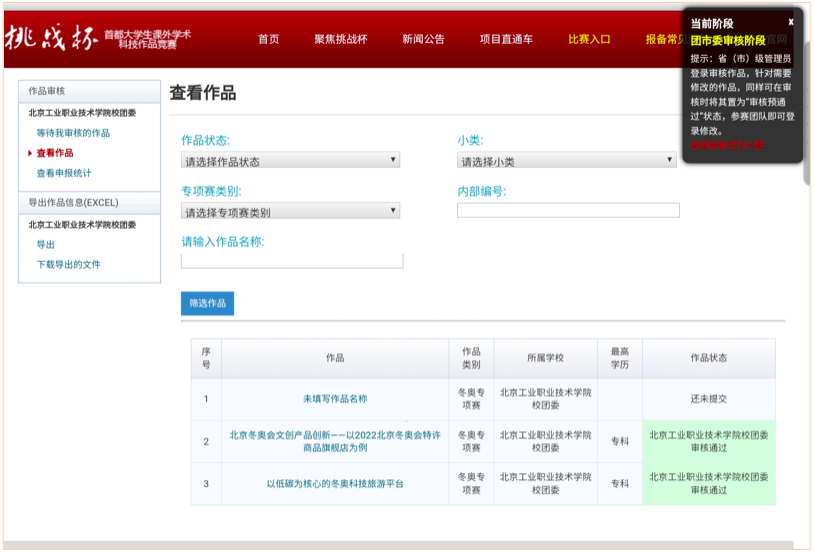 經過指導老師認真輔導及項目審核評比公示,最終“基于STM32的智能導盲杖”、“伺服爬繩器”等十項作品通過校內選拔,推薦至北京市參加本屆大賽的主賽道比賽;“北京冬奧會文創產品創新——以2022北京冬奧會特許商品旗艦店為例”、“以低碳為核心的冬奧科技旅游平臺”兩項作品通過校內選拔,推薦至北京市參加本屆大賽的冬奧專項賽。校內選拔賽結束后,校團委和招生就業處組織專家針對所有推薦參賽作品及參賽團隊進行了一對一的賽前輔導。