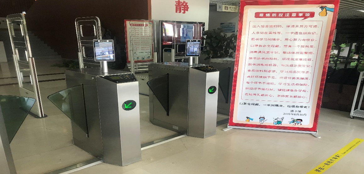 圖書館各部門相互配合,從防疫物資保障、館舍設施消毒、開放時間安排、讀者入館管理、安全引導標識及應急預案等方面做了細致安排,制作、全館擺放圖書館入館須知,編寫防控工作順口溜,方便讀者閱讀、記憶、遵守;設置入口檢測區、二次測溫區,在入口閘機處安裝測溫識別儀器,在圖書館入口、一層服務臺、自助借還機等地均設置了防控黃線,使讀者能夠有序待檢測溫掃碼入館。
