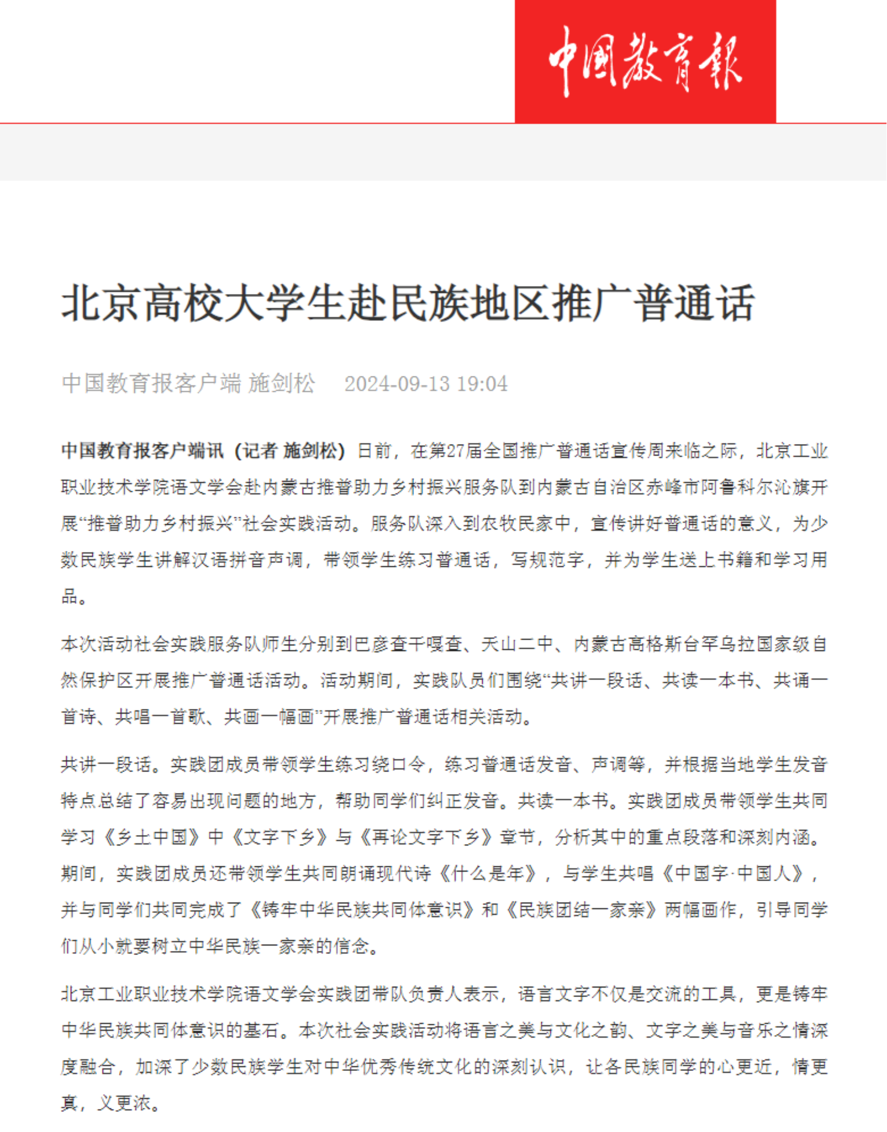語文學會已連續三年獲批教育部、團中央“推普助力鄉村振興”全國大學生暑期社會實踐志愿服務活動團隊,此項指標為首輪“雙高”校驗收指標,我校也是三年來北京市唯一獲批此項目的高職院校。2024年實踐團隊赴內蒙古自治區赤峰市阿魯科爾沁旗牧區和學校開展推普活動,活動圍繞“共講一段話、共讀一本書、共誦一首詩、共唱一首歌、共畫一幅畫”開展相關活動,將語言之美與文化之韻、文字之美與音樂之情深度融合,加深少數民族地區對中華優秀傳統文化的深刻認識,鑄牢中華民族共同體意識,讓各民族的心更近,情更真,義更濃。本次社會實踐活動先后得到了《中國教育報》《中國青年報》《北京青年報》《現代教育報》的報道。