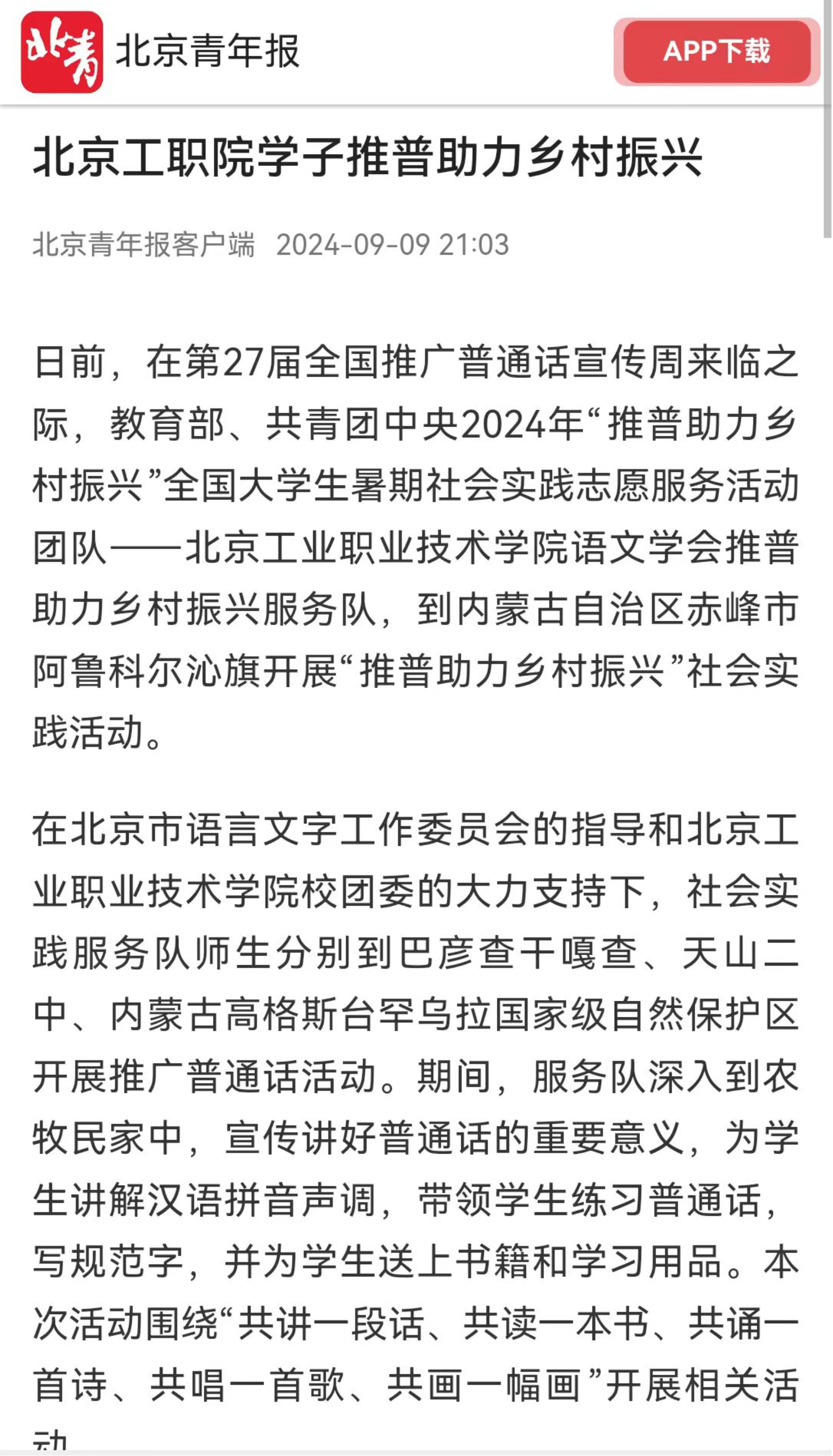 近日,中共北京市委教育工作委員會公布“時代新人強國行”首都大學生主題社會實踐優秀案例獲獎名單,由基礎教育學院葛東雷擔任指導教師、學生社團語文學會申報的示范項目《北京工業職業技術學院語文學會推普助力鄉村振興》獲批為優秀案例。此項目申報基礎為語文學會2024年獲批的教育部、團中央“推普助力鄉村振興”全國大學生暑期社會實踐志愿服務活動。