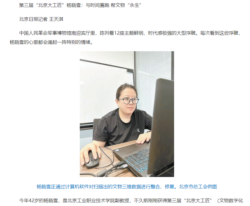 5月23日,北京日報以《第三屆‘北京大工匠’楊曉雪:與時間賽跑 幫文物“永生”》為題,報道了我校楊曉雪副教授優秀事跡。