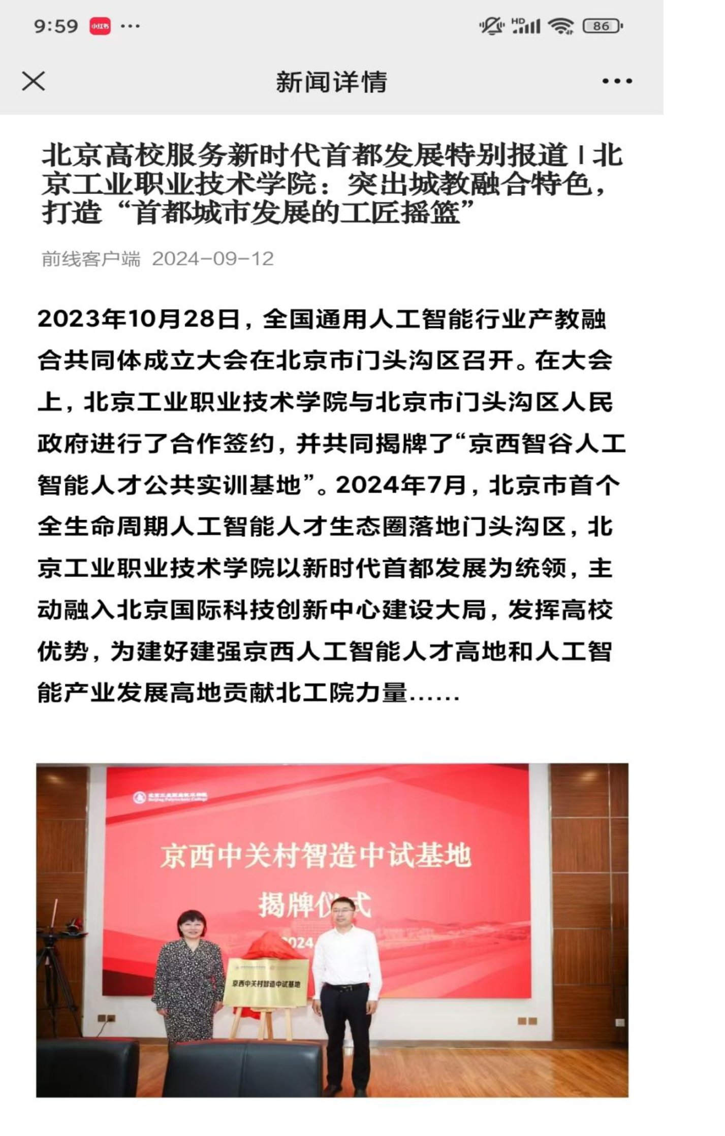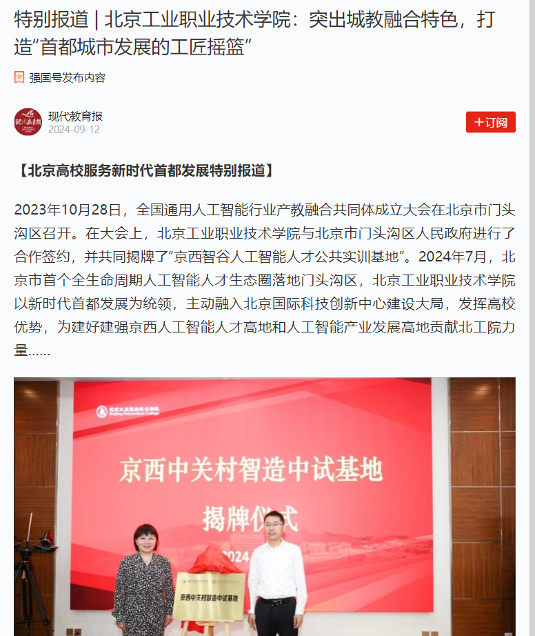 2023年10月28日,全國通用人工智能行業產教融合共同體成立大會在北京市門頭溝區召開。在大會上,北京工業職業技術學院與北京市門頭溝區人民政府進行了合作簽約,并共同揭牌了“京西智谷人工智能人才公共實訓基地”。2024年7月,北京市首個全生命周期人工智能人才生態圈落地門頭溝區,北京工業職業技術學院以新時代首都發展為統領,主動融入北京國際科技創新中心建設大局,發揮高校優勢,為建好建強京西人工智能人才高地和人工智能產業發展高地貢獻北工院力量……
