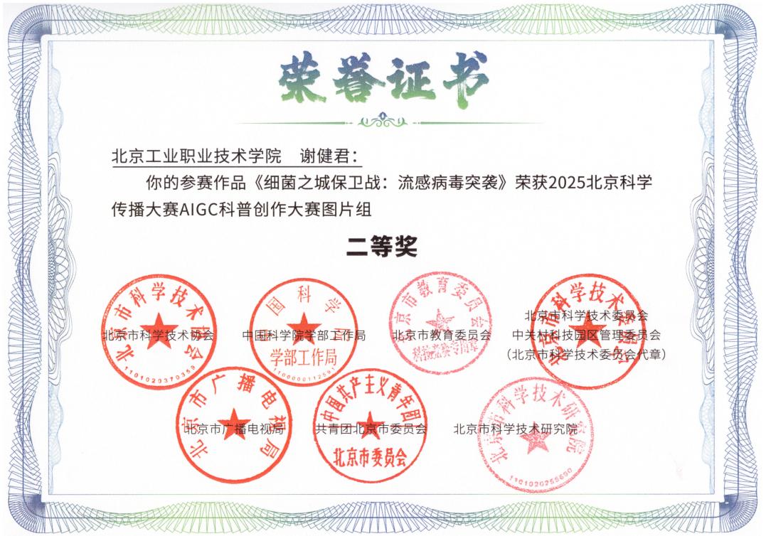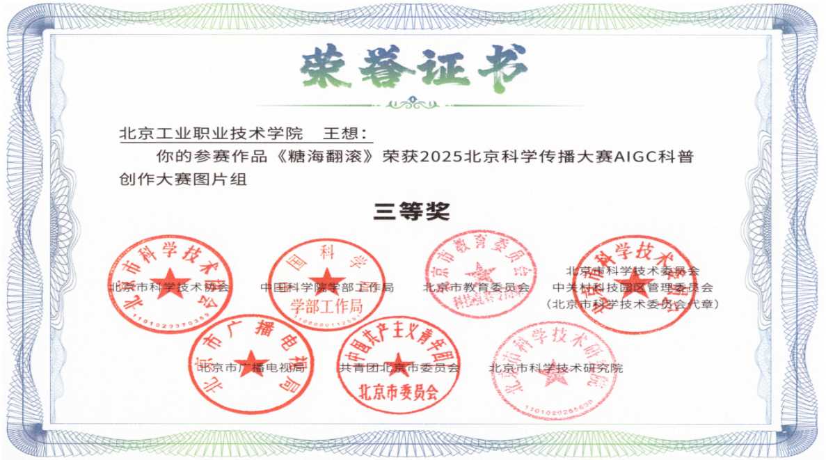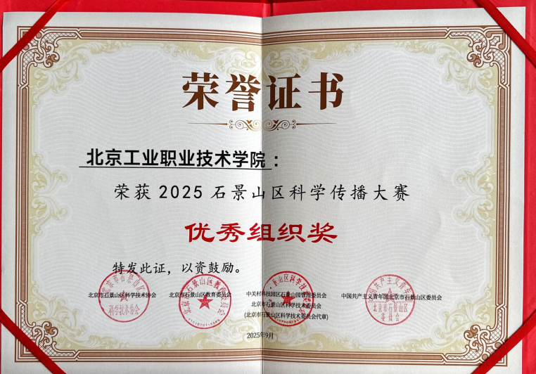 近日,我校在2025年北京市及石景山區科學傳播大賽中雙線告捷:在“2025北京科學傳播大賽”中榮獲二等獎1人、三等獎1人;在“2025石景山區科學傳播大賽”中榮獲一等獎3人、二等獎4人、三等獎8人。與此同時,憑借在賽事組織中的高效統籌、師生參與的高漲熱情及作品呈現的專業水準,學校榮膺兩級賽事“優秀組織獎”,充分彰顯了學校“以賽促育”的職業教育特色和“服務區域發展”的使命擔當。