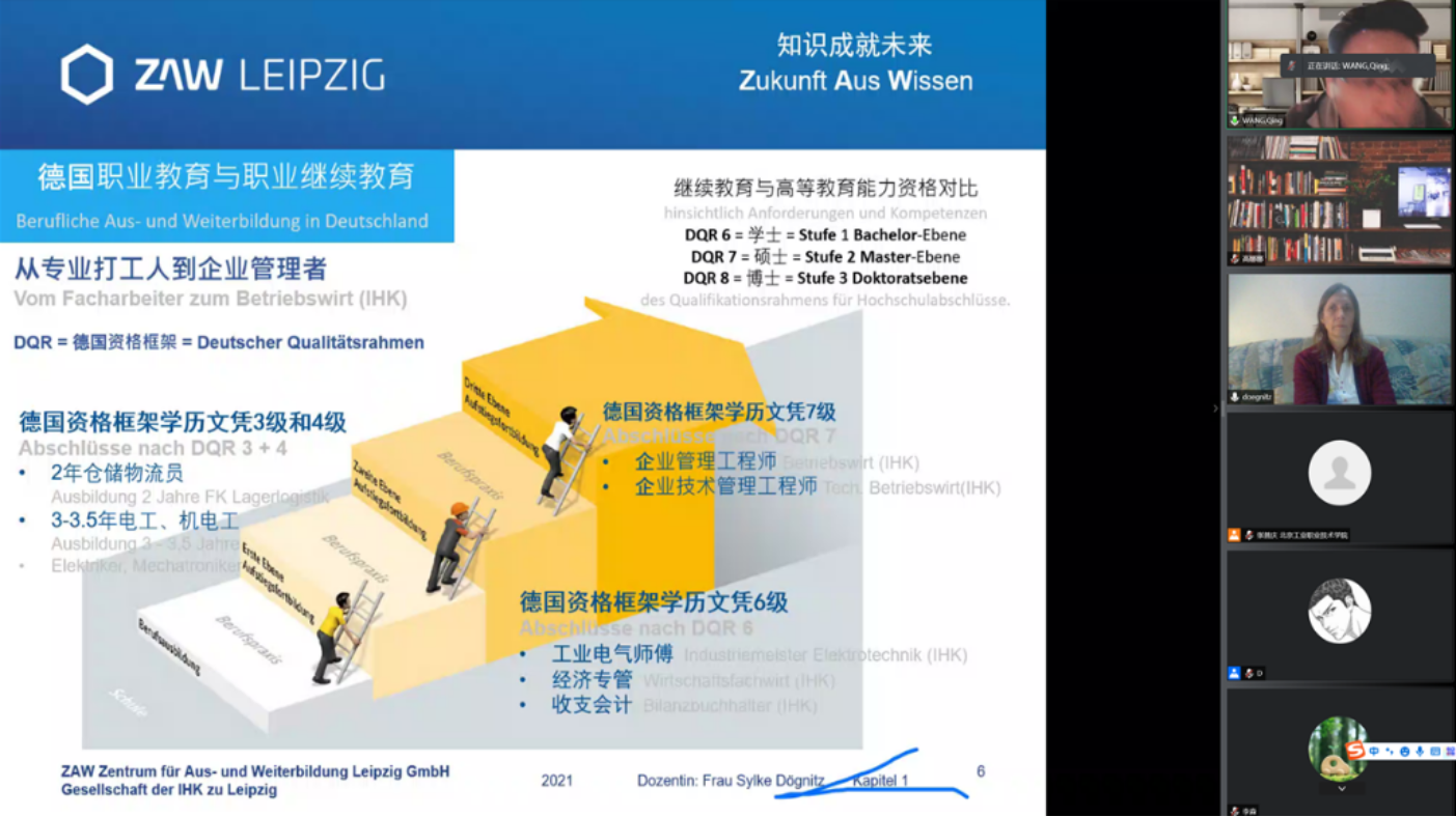 2021年12月6日19時,機電工程學院組織的德國雙元制教學能力線上師資培訓舉辦開班儀式,出席開班儀式的有德國萊比錫職業技術與繼續教育中心國際項目主管希爾克德西尼茲女士、迪特蘇特納先生,中德職業教育產教融合聯盟秘書長劉宇先生,我校副校長馮海明、人事處處長徐文廣、機電工程學院黨總支書記王懷群、院長張春芝、副院長張普慶和全體參培教師。