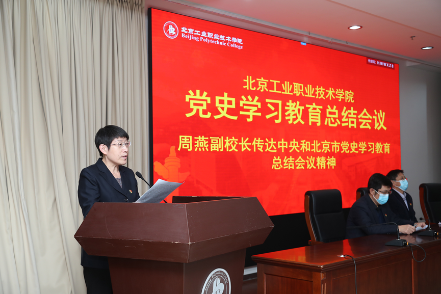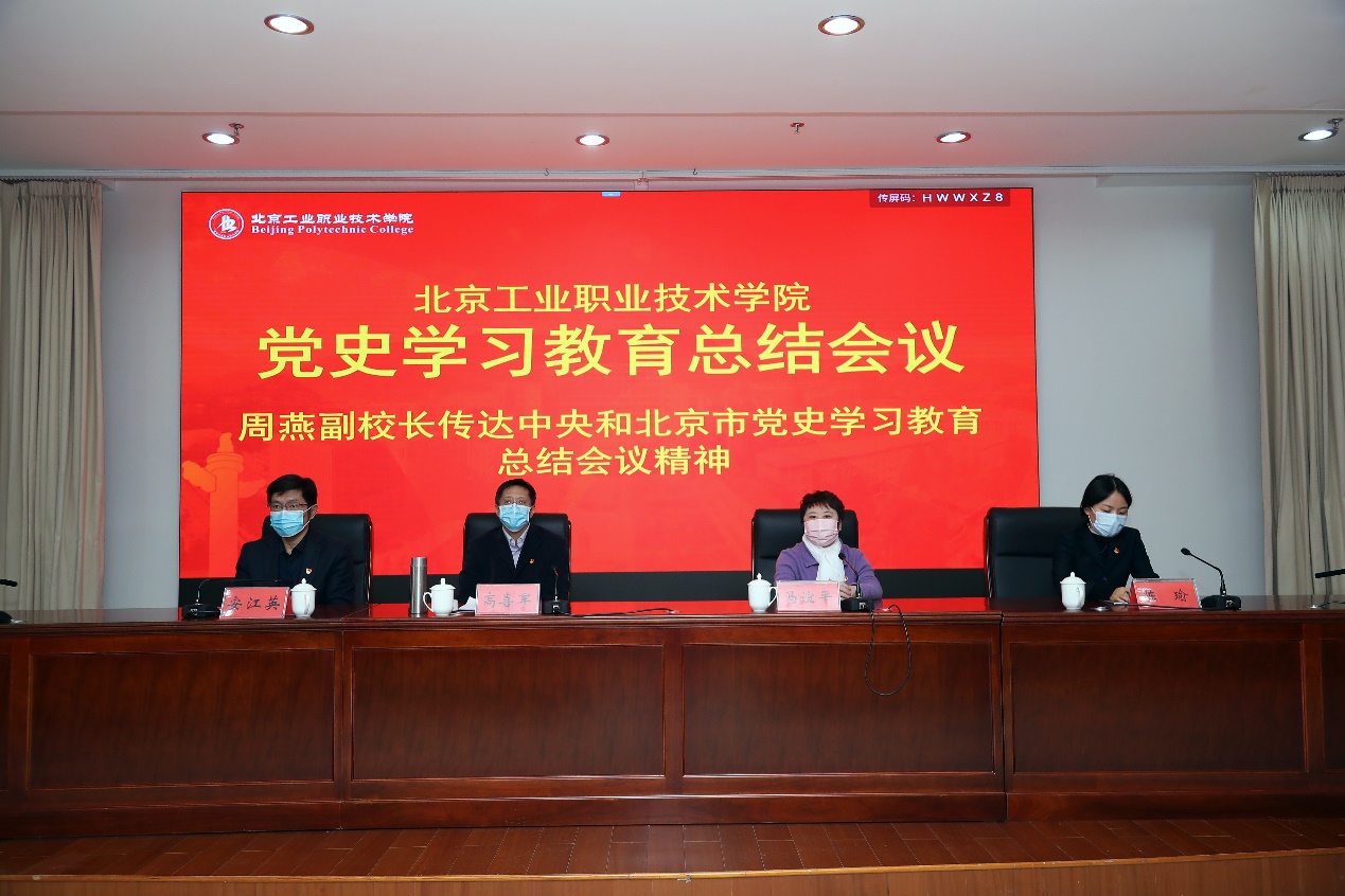 1月21日下午,北京工業(yè)職業(yè)技術(shù)學(xué)院召開黨史學(xué)習(xí)教育總結(jié)會議,深入學(xué)習(xí)貫徹習(xí)近平總書記的重要指示和中央、北京市黨史學(xué)習(xí)教育總結(jié)會議精神,全面總結(jié)回顧學(xué)校黨史學(xué)習(xí)教育開展情況,部署鞏固拓展黨史學(xué)習(xí)教育成果,把學(xué)習(xí)貫徹黨的十九屆六中全會精神不斷引向深入。北京教育系統(tǒng)第四指導(dǎo)組組長馬誼平、成員陳瑜到會指導(dǎo)。學(xué)校領(lǐng)導(dǎo)班子全體成員,學(xué)校黨史學(xué)習(xí)教育領(lǐng)導(dǎo)小組成員、校內(nèi)指導(dǎo)組成員、全體中層干部、黨支部書記、團總支書記出席會議。學(xué)校黨委書記、黨史學(xué)習(xí)教育領(lǐng)導(dǎo)小組組長高喜軍作黨史學(xué)習(xí)教育總結(jié)講話,黨委副書記、院長安江英主持會議。