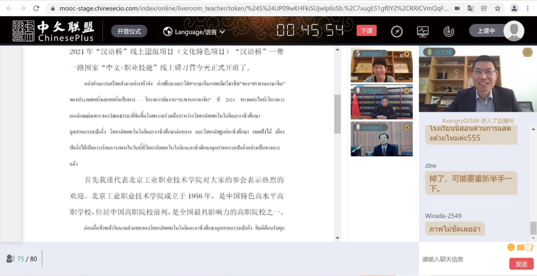 1月10日,北京工業職業技術學院“漢語橋”一帶一路國家“中文+職業技能”線上研習營(文化特色項目)開營儀式在線上順利舉行。北京工業職業技術學院副校長周燕、洛陽職業技術學院副校長李保安、北京市豐臺區職業教育中心學校副校長李毓榮、我校國際合作處副處長孟晴、洛陽職院國際教育中心主任蘇萌、豐臺職教中心國際部主任杜靜、各院校授課教師代表以及自泰國孔敬大學和泰國格樂大學的118名學員參加了開營儀式。儀式由國際交流合作處占文鋒老師主持。