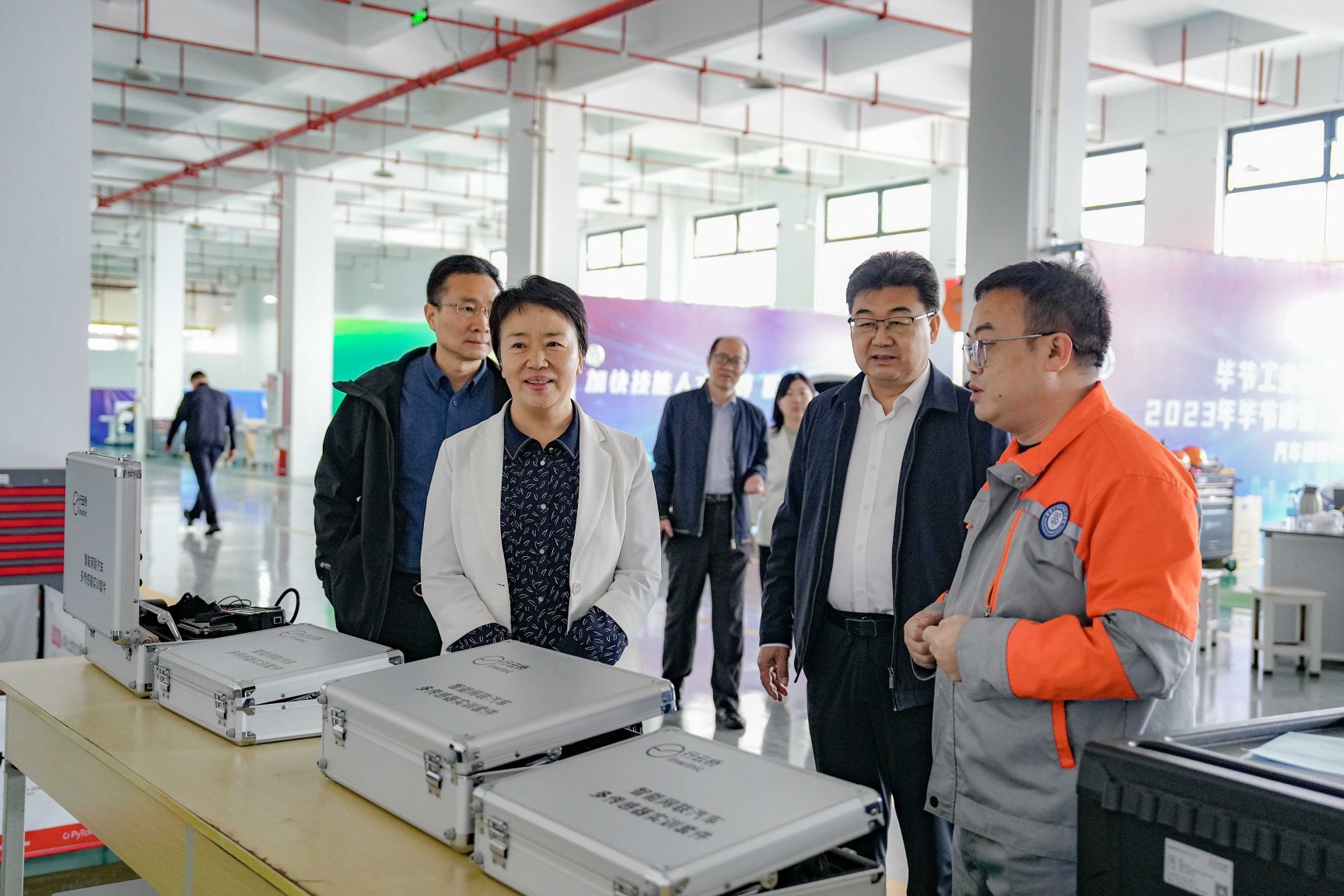 4月19日上午,在畢節工業職業技術學院黨委書記周杰、黨委委員、副校長黃瑛陪同下,調研組參觀了智慧化礦井綜合模擬控制實訓系統、應急救援現場急救實訓室、新能源整車結構懸浮立體數字教學實訓室、機電工程系實訓基地等教學實踐設施。雙方圍繞產教融合人才培養模式、訂單班培養、技術研發服務地方經濟等內容,展開多維度探討,共商職業教育創新發展新路徑。