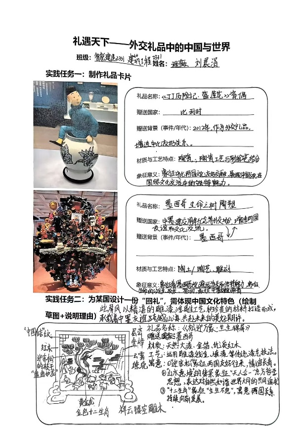 建筑工程 2331 班的劉晨涓表示:“這次實踐活動讓我真切感受到世界文化的多元與交融。館內禮品有的如金孔雀般精美華貴,有的如陶制圖騰般質樸抽象,都承載著他國文化精髓與外交情誼。在講解員生動解說下,我們仿佛打開了一扇扇通往世界文明的窗戶,得以領略不同民族的精神世界與生活智慧,真切體會到‘各美其美,美美與共’的開放胸懷。參觀結束后,我深刻認識到,這些禮物不僅是外交禮儀的象征,更是人類文明互鑒的縮影。正如展廳結束語所說:‘禮物雖輕,情誼千鈞;文明各異,大道同行。’”