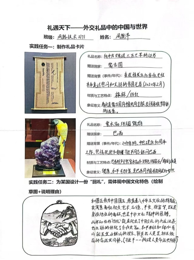 網絡技術 2331 班的張震說:“參觀過程中,我深切感受到中國外交的開放包容與合作共贏精神。在‘文明互鑒’專題區,那些融合了中西方藝術元素的定制禮品,生動詮釋著‘各美其美,美美與共’的外交智慧。這不僅是一場視覺盛宴,更是一堂生動的外交思政課。從青銅禮器到現代工藝精品,國禮的演變串聯起新中國的外交征程,讓我對我國的外交成就倍感自豪,也激勵我以更開闊的視野和更堅定的信念,為國家發展貢獻力量?!?/p>