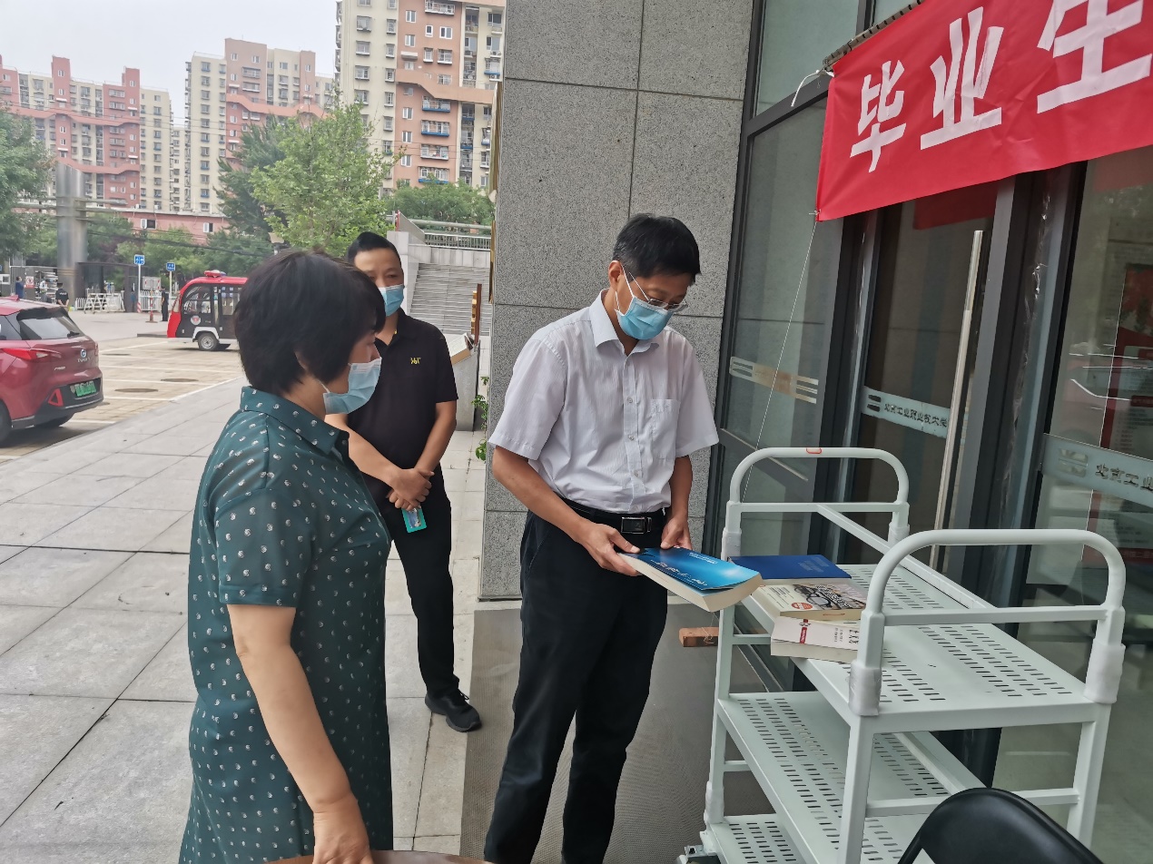 7月2日早晨,高喜軍書記和魏曉東副書記首先來到學(xué)校西南門,查看畢業(yè)生進(jìn)校核查身份和檢測健康狀況的流程。隨后到圖書館看望辦理學(xué)生還書的老師。
