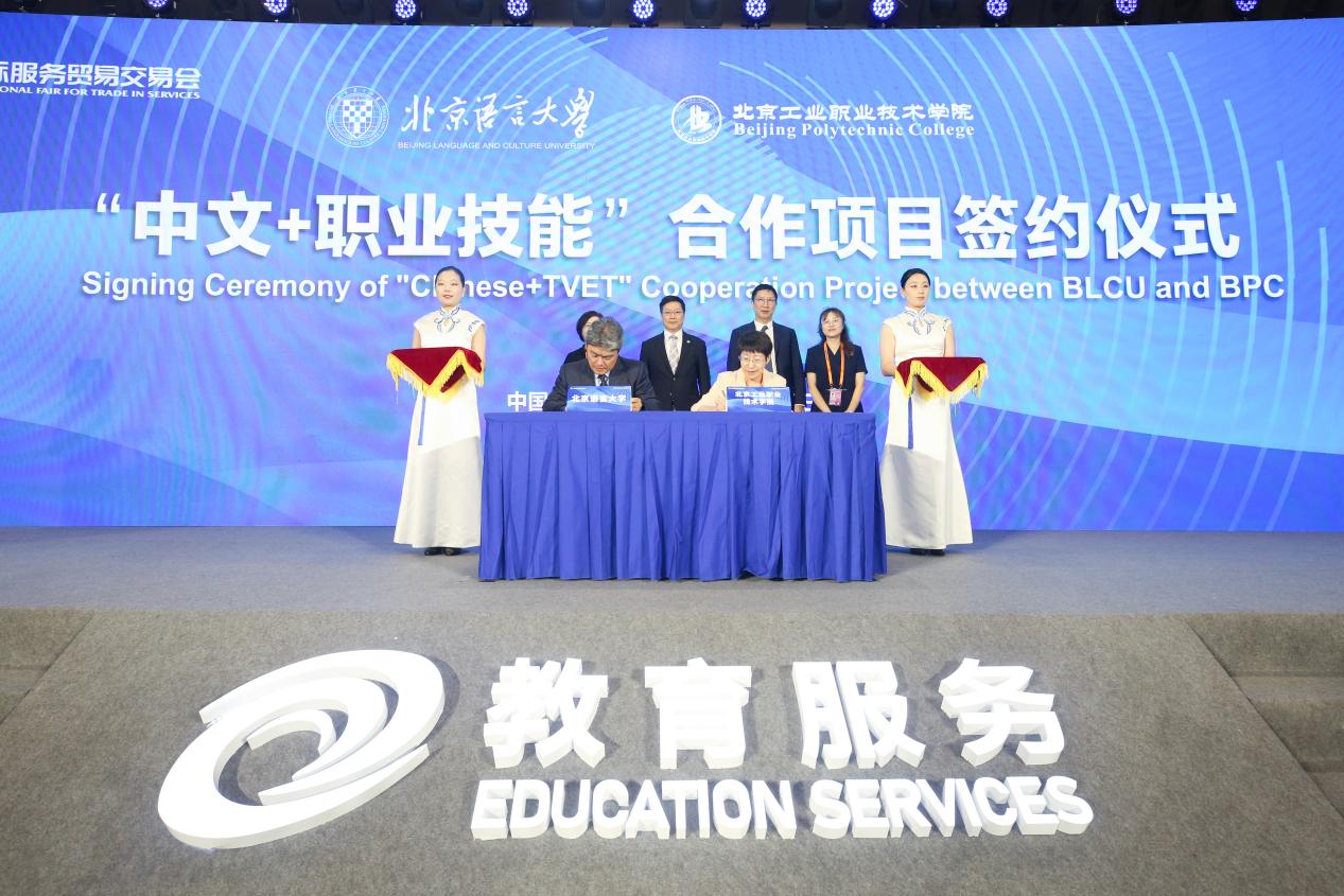 在教育部中外語言交流合作中心(以下簡稱“語合中心”)和北京市教育委員會(以下簡稱“市教委”)的大力支持下,我校與北京語言大學于服貿會開幕當天,在北京市教委舉辦的職業教育國際化專題活動上舉行“中文+職業技能”項目合作簽約儀式。教育部語合中心副主任胡志平發表致辭并見證了簽約。北京語言大學黨委常委、副校長張寶鈞和我校黨委常委、副院長周燕分別發言。北京市教委副主任孫其軍、我校黨委書記高喜軍、北京語言大學應用中文學院院長蘇英霞、我校國際處處長孟晴和與會百余所學校來賓一同見證了這一重要時刻。該項目是全國首例由語言類本科院校與高職院校共建的“中文+職業技能”深度融合項目,再創國際中文教育新模式。