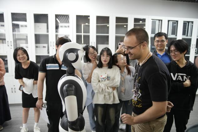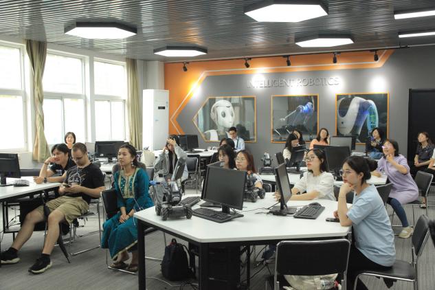 在善技樓110教室,機(jī)電工程學(xué)院黃歡老師為國(guó)際學(xué)生們教授了智能機(jī)器人課程,介紹了生活中的人型機(jī)器人、機(jī)器狗和掃地機(jī)器人等智能機(jī)器人類(lèi)型,以及智能機(jī)器人的感知技術(shù)和自我決策能力等,并在助教老師的協(xié)助下,向國(guó)際學(xué)生們展示了各類(lèi)智能機(jī)器人的實(shí)際運(yùn)行和操作。同學(xué)們都積極踴躍地參與到課程學(xué)習(xí)和實(shí)操互動(dòng)當(dāng)中,比如操作機(jī)器狗完成“后空翻”動(dòng)作、與人型機(jī)器人玩笑對(duì)話(huà)、在“You raise me up”的優(yōu)美歌聲中同機(jī)器人一起跳舞等,課堂氣氛非常活躍。