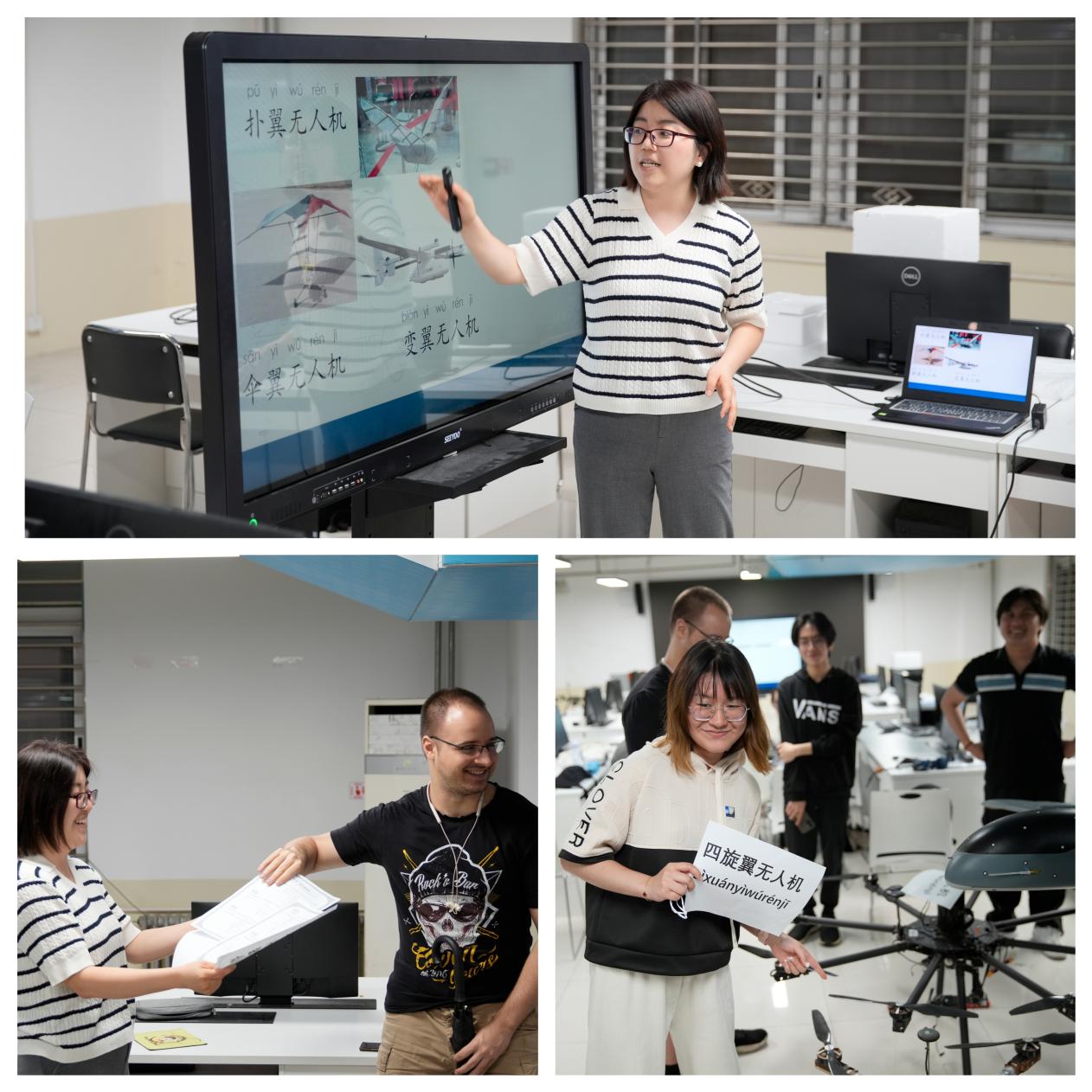 北語(yǔ)師生們先到匠心樓地下一層無(wú)人機(jī)實(shí)訓(xùn)室,跟隨建筑與測(cè)繪工程學(xué)院的劉彥君老師學(xué)習(xí)了無(wú)人機(jī)操控課程,了解了無(wú)人機(jī)的定義、類(lèi)型和操作方式。劉老師還為國(guó)際學(xué)生們?cè)O(shè)計(jì)了“考考大家”的課堂活動(dòng),要求學(xué)生在現(xiàn)場(chǎng)多部無(wú)人機(jī)實(shí)體當(dāng)中找出與名稱(chēng)相對(duì)應(yīng)的無(wú)人機(jī)類(lèi)型,并在劉老師和我校優(yōu)秀學(xué)生的示范和指導(dǎo)下,進(jìn)行了無(wú)人機(jī)模擬飛行的實(shí)操訓(xùn)練。